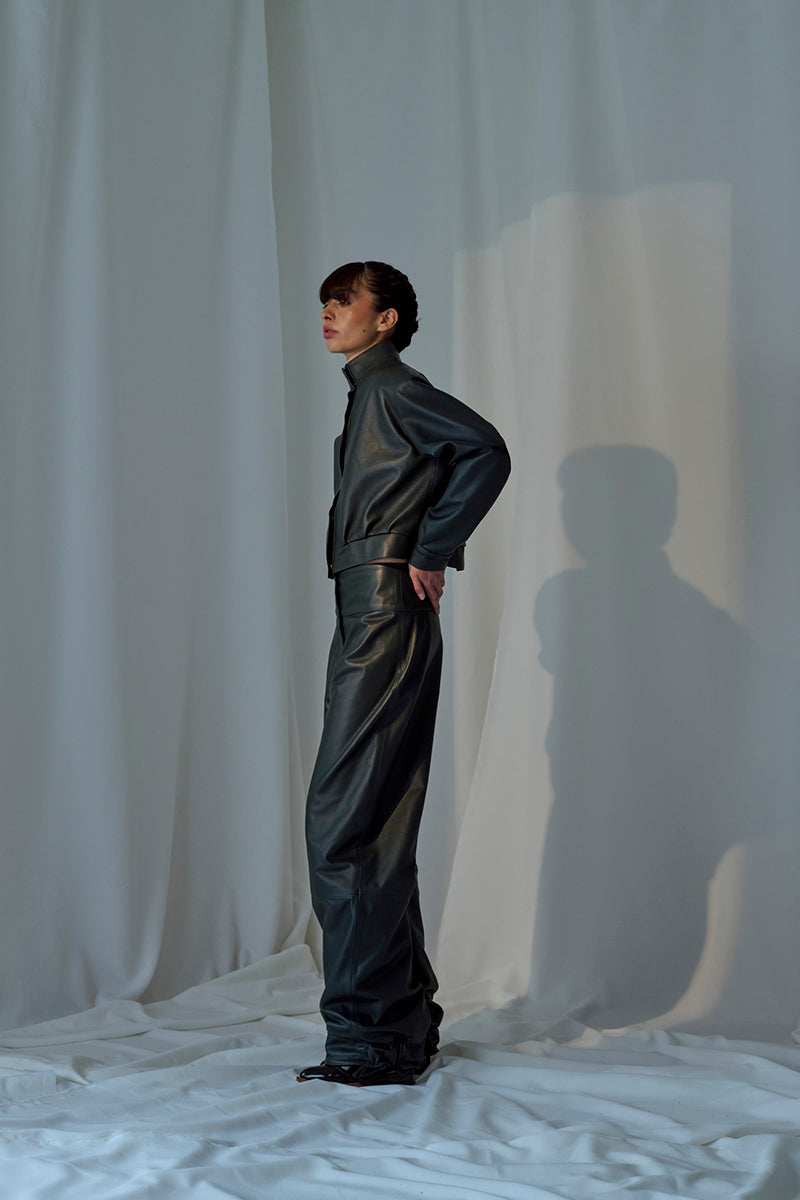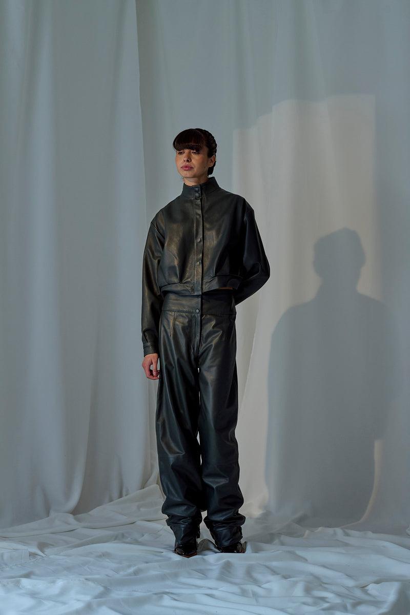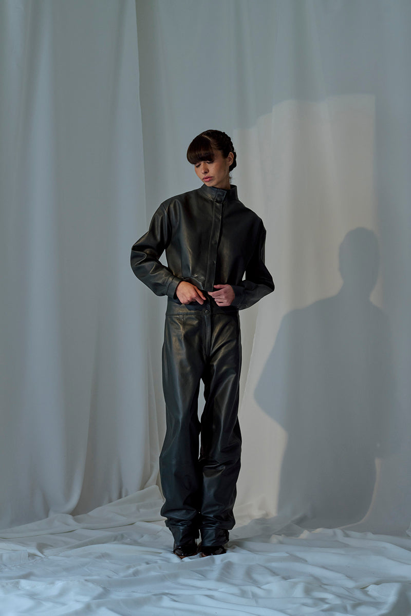 - جاكيت جلد قصير بياقة عالية