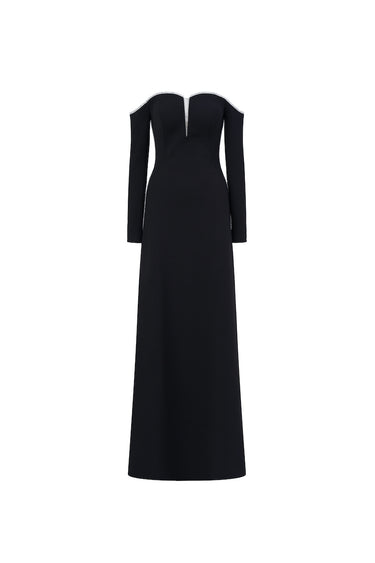 فستان ماكسي بأكمام طويلة مكشوف الكتفين مصنوع من قماش الكريب البوليستر