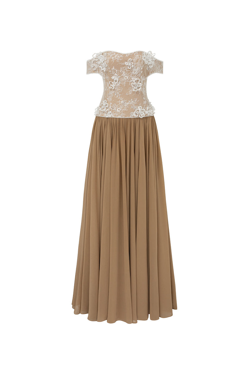 فستان ماكسي مكشوف الكتفين من الشيفون والدانتيل اللامع
