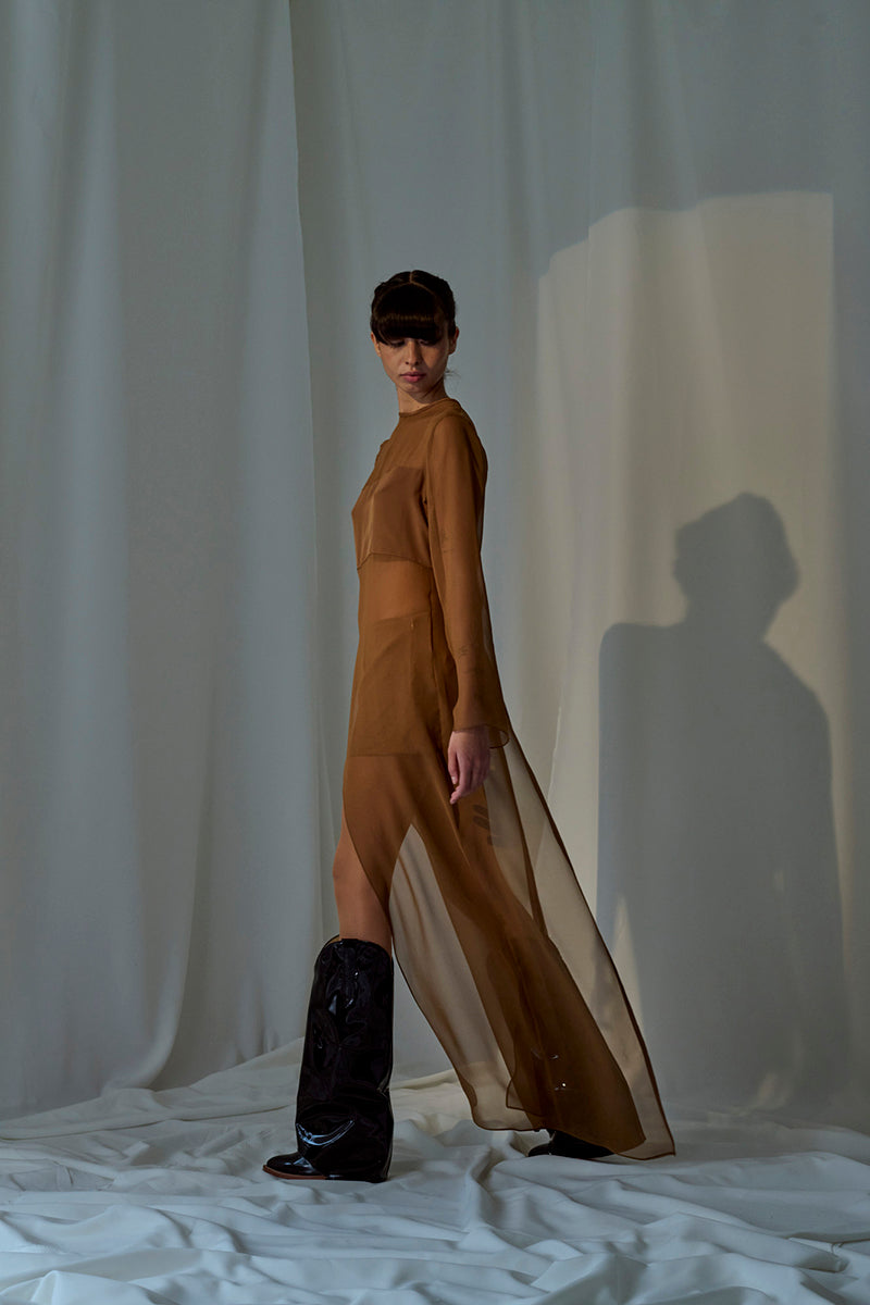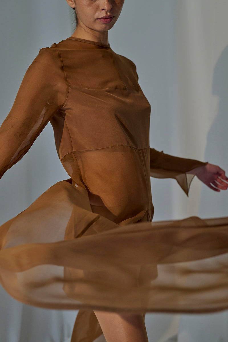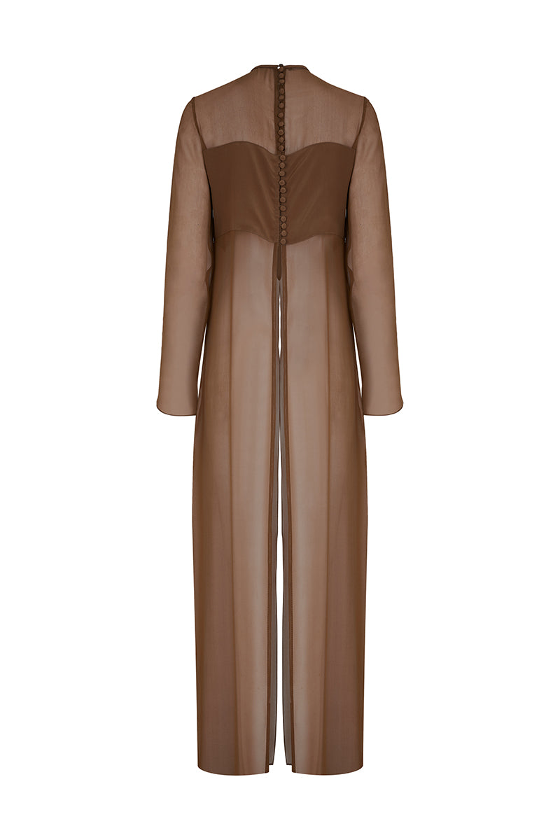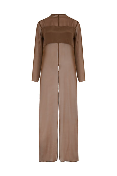 بلوزة شيفون طويلة ذات ياقة دائرية وأكمام طويلة، مفتوحة من الأمام والخلف مع تفاصيل من الكريب على الصدر.