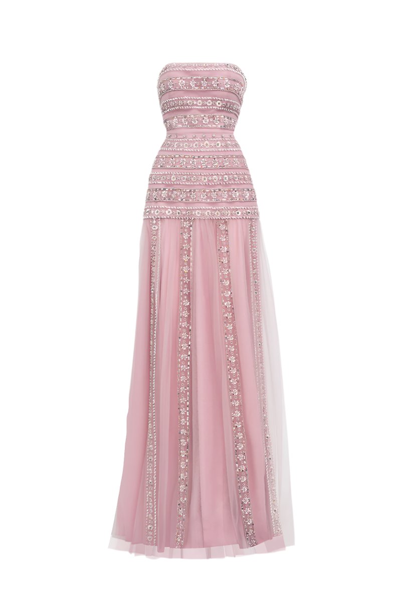 فستان ماكسي شبكي مزين بغطاء للرأس باللون الوردي الباهت