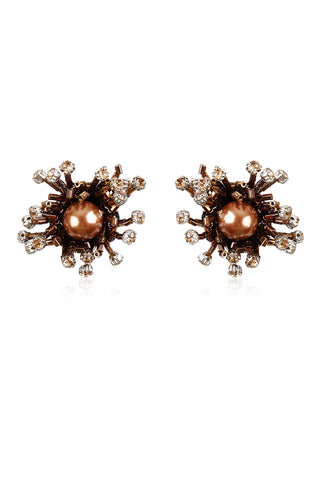 أقراط أنيقة منقطة، مرصعة بلؤلؤ صناعي بني اللون، مزينة بكريستالات أكريليك شفافة وخرز بني معدني. مثالية لإطلالة أنيقة وعصرية.