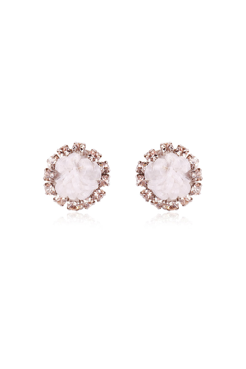 أقراط مشبكية بترتر أبيض منسوج في المنتصف، محاطة بكريستالات أكريليك بلون العسل. أنيقة ومريحة للارتداء اليومي.