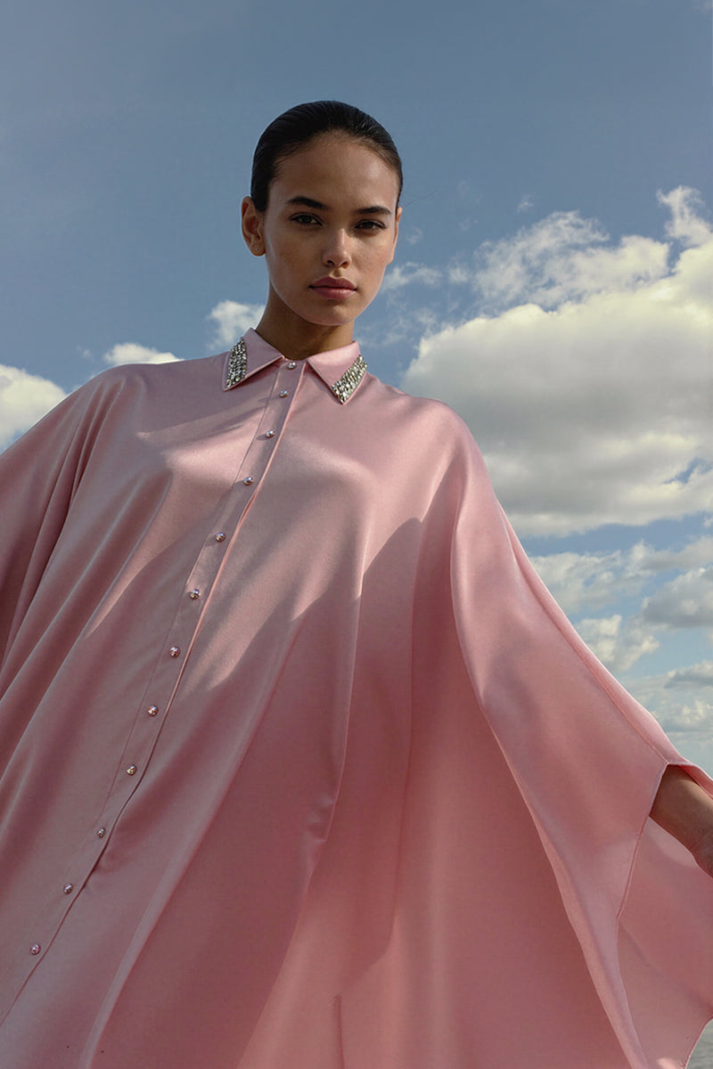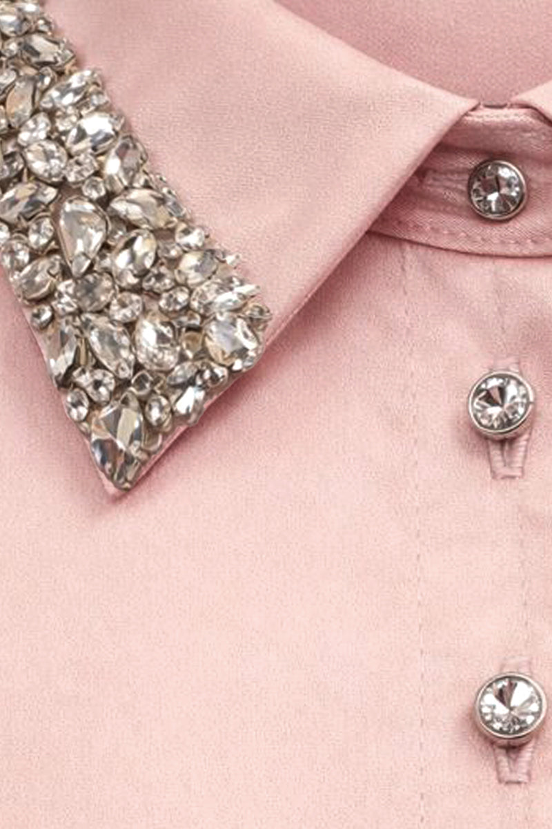 مصنوعة من الساتان الانسيابي ذي الملمس الحريري، تتميز هذه القطعة بياقة مدببة مصممة خصيصاً ومزينة يدوياً بكريستالات سواروفسكي البراقة. يمتد صف من أزرار الكريستال المتناسقة على طول الجزء الأمامي، مما يضفي لمعاناً خفيفاً وتفاصيل راقية.