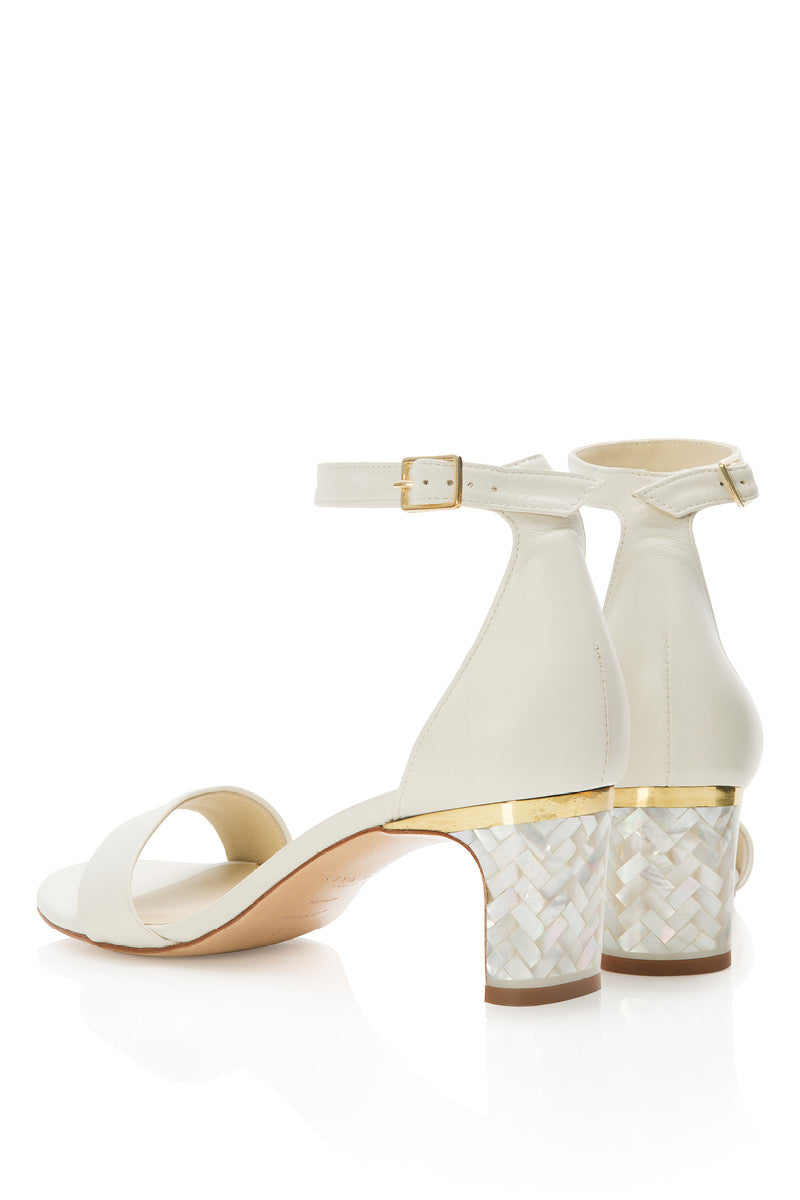 صندل أبيض بكعب عالٍ مزين باللؤلؤ