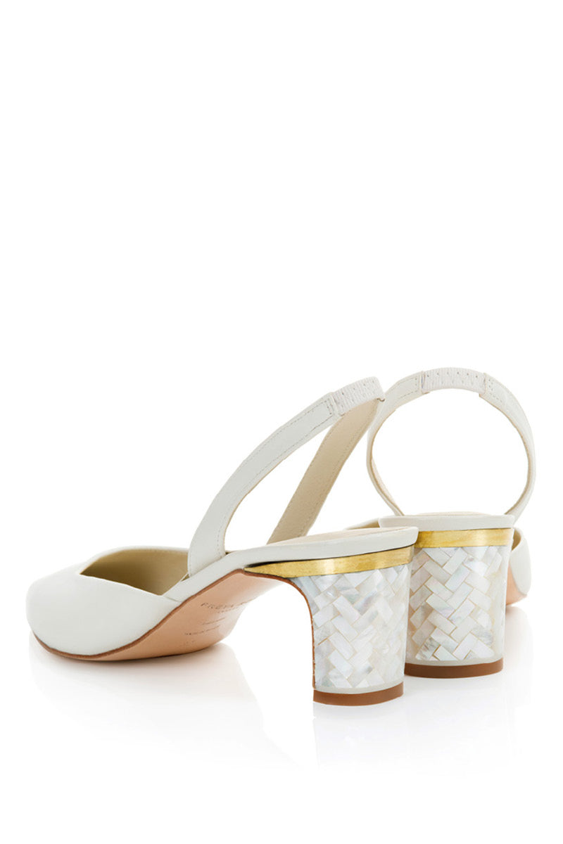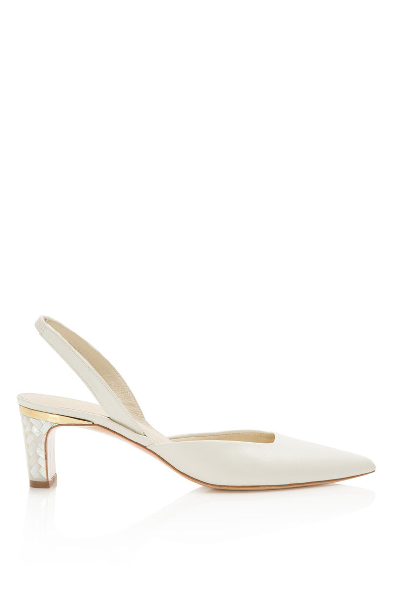 حذاء دلفين بكعب عالٍ من الجلد واللؤلؤ باللون العاجي