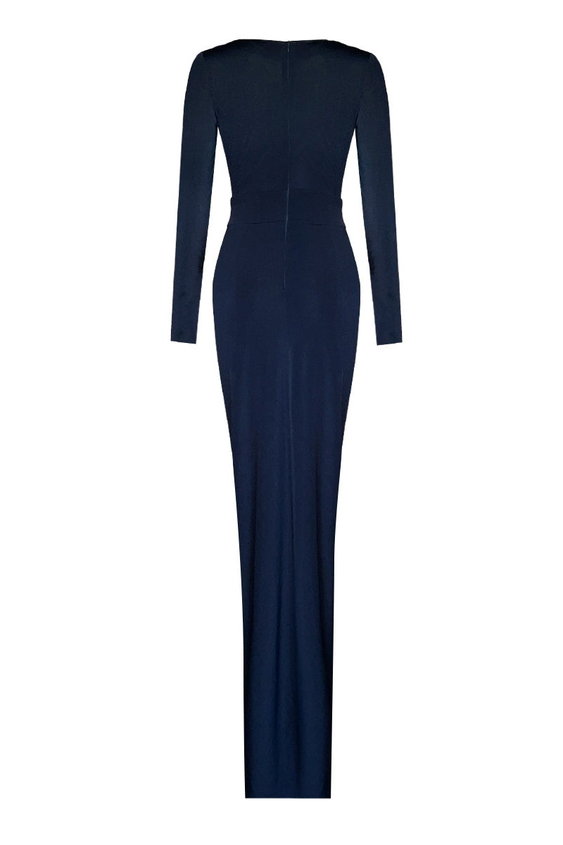 - النمط: فستان طويل بأكمام طويلة وياقة مغلقة