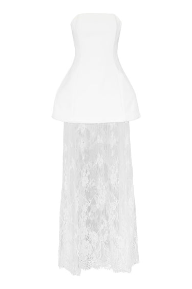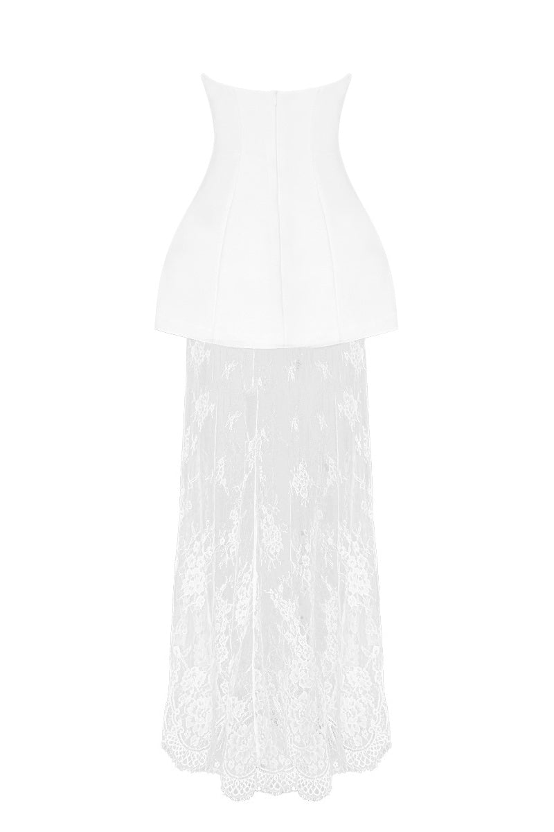 يضفي فستان سايرن لمسة جريئة وأنيقة على ملابس الزفاف العصرية بفضل الجزء العلوي القصير بدون حمالات والتنورة الطويلة الشفافة المصنوعة من الدانتيل.