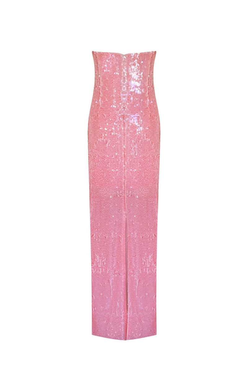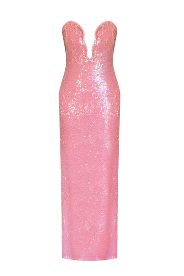 يضفي فستان روزيلا لمسة رومانسية وجريئة ومتألقة على فساتين السهرة العصرية بفضل زخارفه المصنوعة من الترتر الوردي وقصته الأنيقة التي تتميز بفتحة رقبة عميقة.