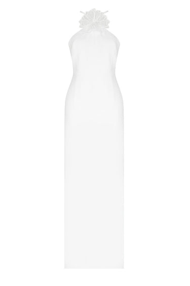 - التصميم: فستان زفاف طويل وبسيط بياقة هالتر