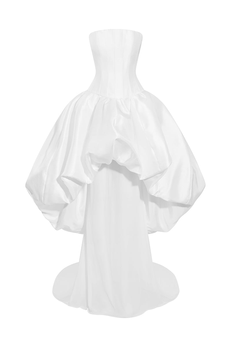 - فستان أبيض بدون حمالات بتصميم طليعي