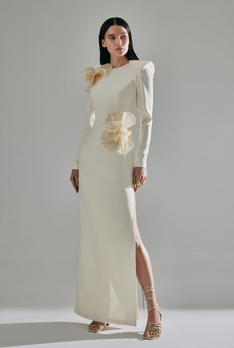 - فستان كريب متوسط الطول مع تفاصيل زهور ثلاثية الأبعاد مزينة بالترتر
