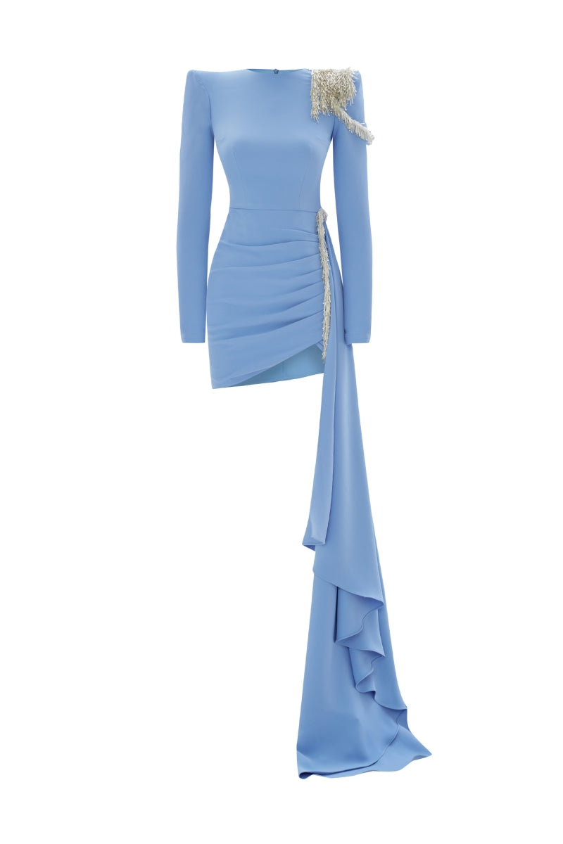 فستان قصير مطرز بشكل غير متماثل باللون الأزرق