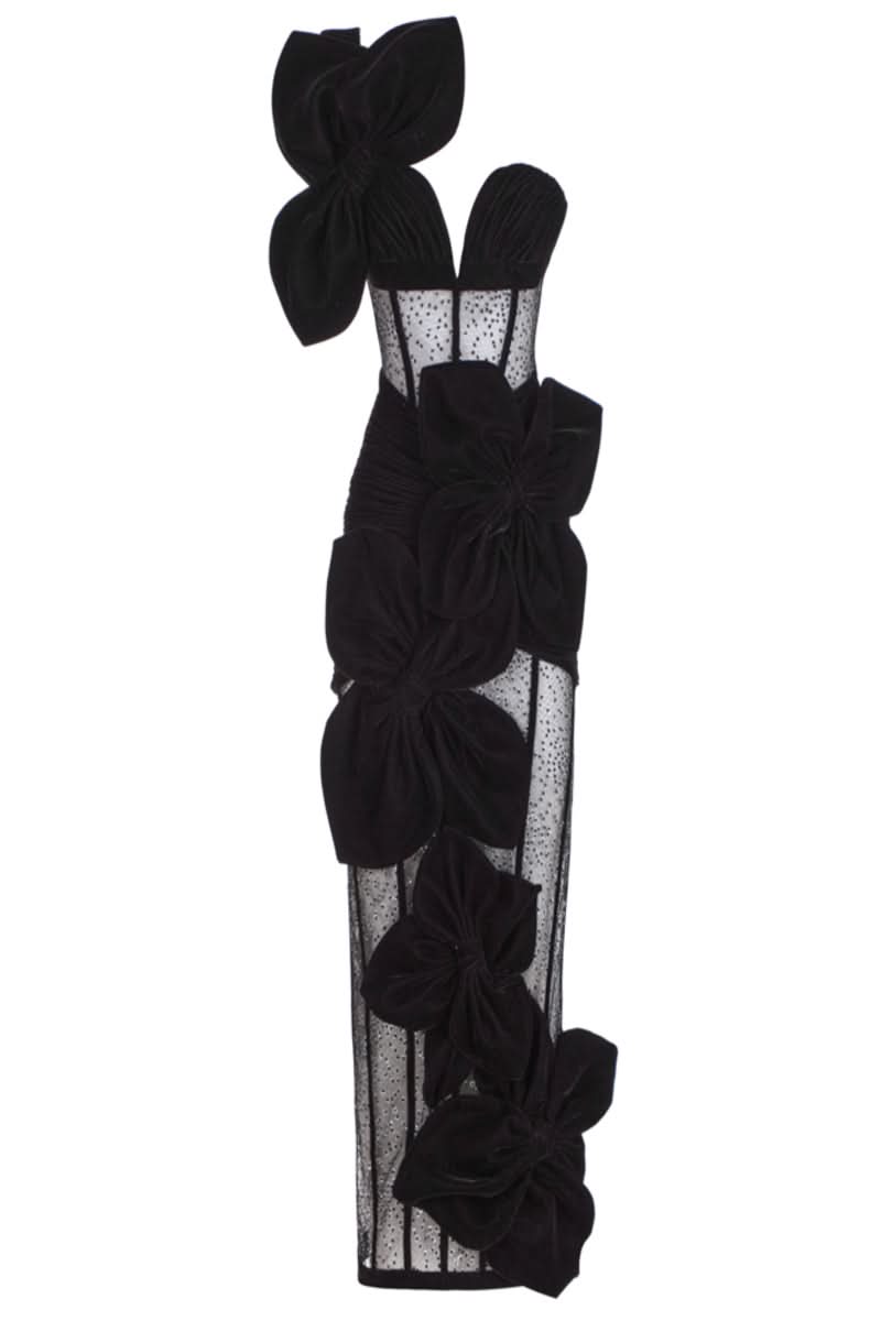 فستان مشد مخملي على شكل زهرة سوداء بطول الكاحل