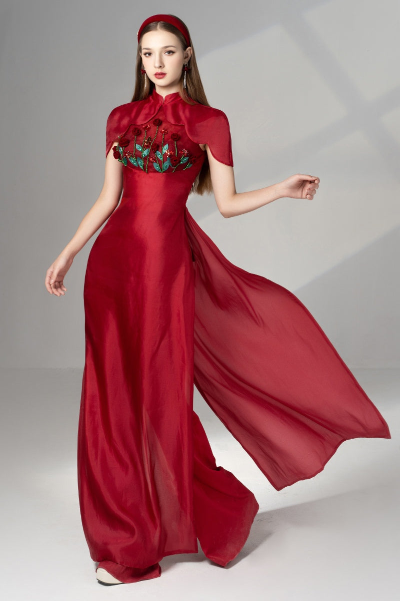 brianna غمد الحرير الأورجانزا ماكسي ao dai والسراويل