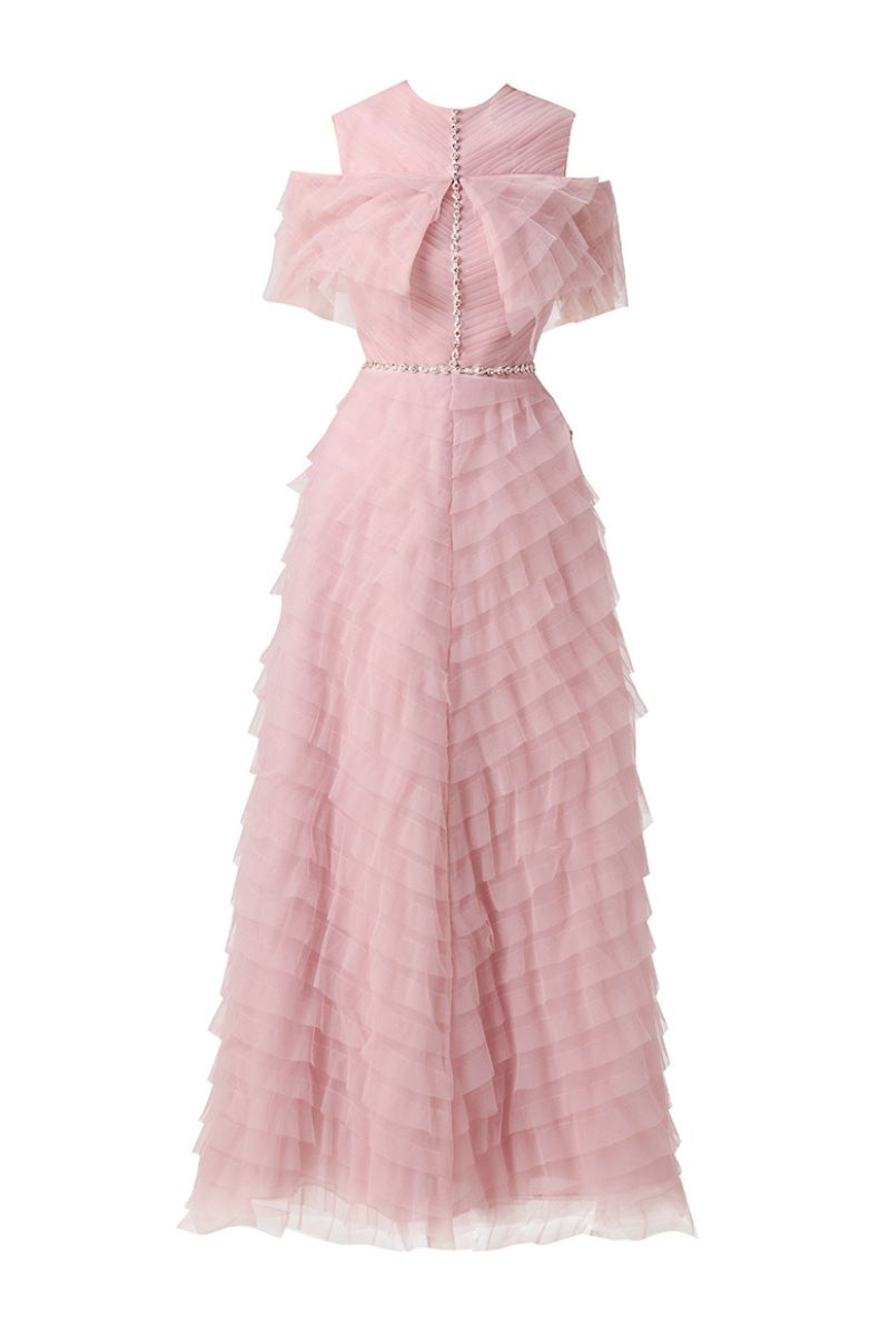 فستان ميدي من الأورجانزا بأكمام مكشوفة الكتفين باللون الوردي