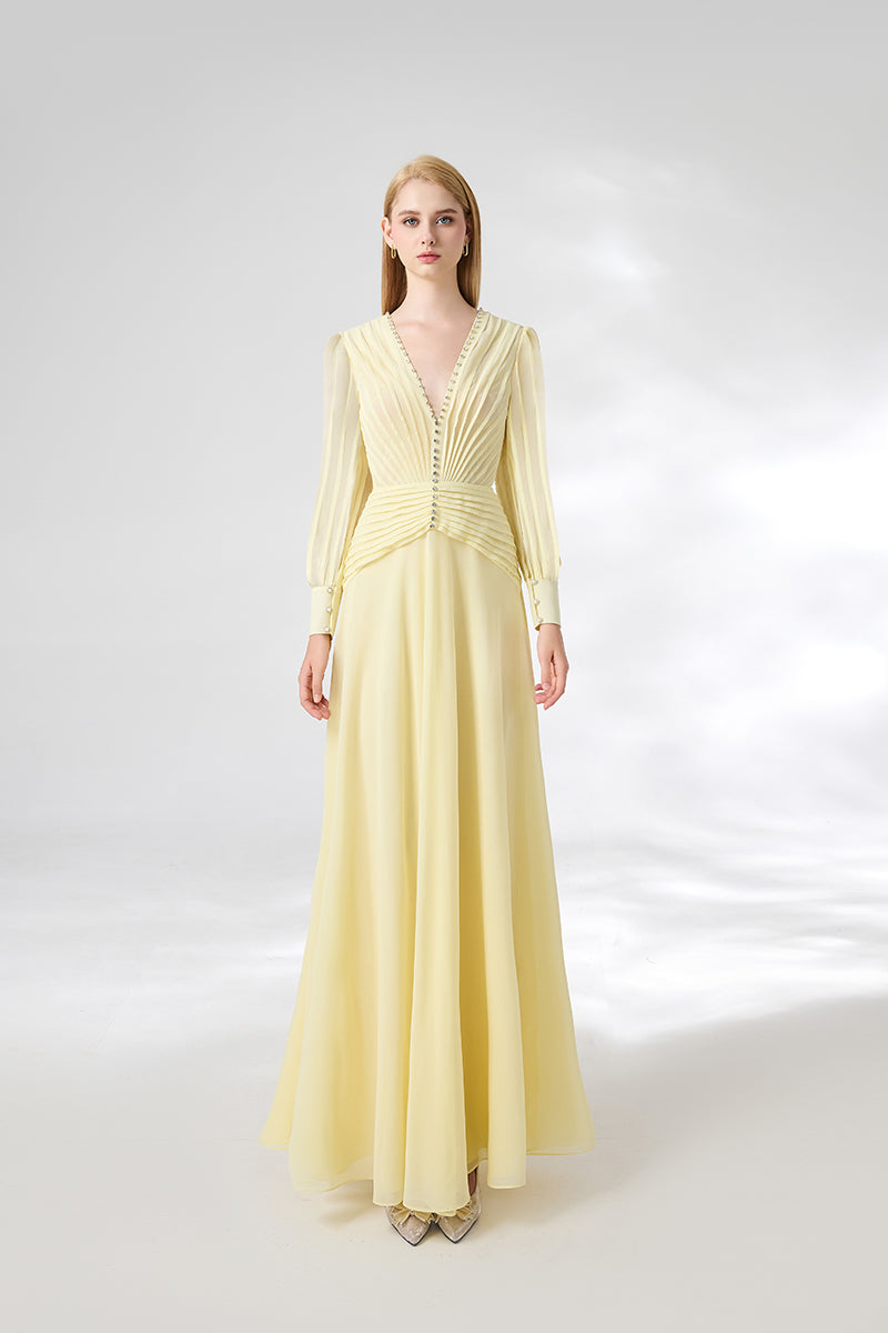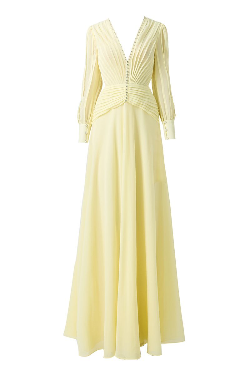 فستان أصفر فاتح برقبة على شكل حرف v وطول يصل إلى الأرض