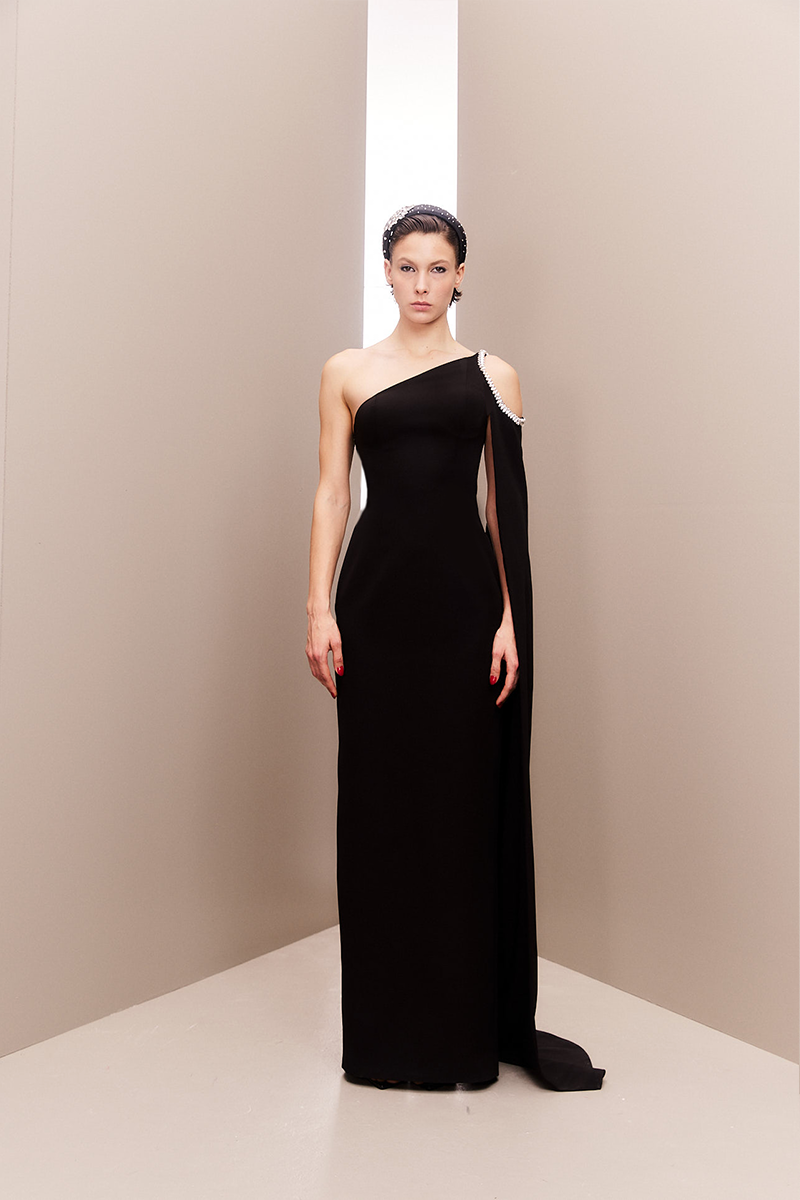 ثوب أسود غير متماثل مرصع بالأحجار
