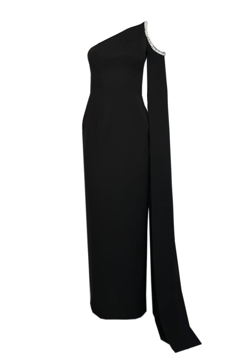 ينضح الفستان الأسود غير المتماثل والمزين بالأحجار بالأناقة والدراما بتصميمه ذو الكتف الواحد والأكمام الطويلة المذهلة التي تتميز بفتحة آسرة مزينة بأحجار على شكل ماركيز. يضيف التصميم الدقيق لهذه الزخارف لمسة من السحر إلى القماش الأسود الأنيق، مما يضمن جذب انتباه مرتديها في أي مناسبة. بفضل السحاب الجانبي غير المرئي والملاءمة الجذابة، يجمع هذا الفستان بسلاسة بين الرقي والجاذبية، مما يجعله خيارًا متميزًا لأولئك الذين يسعون إلى الإدلاء ببيان في المناسبات الرسمية.