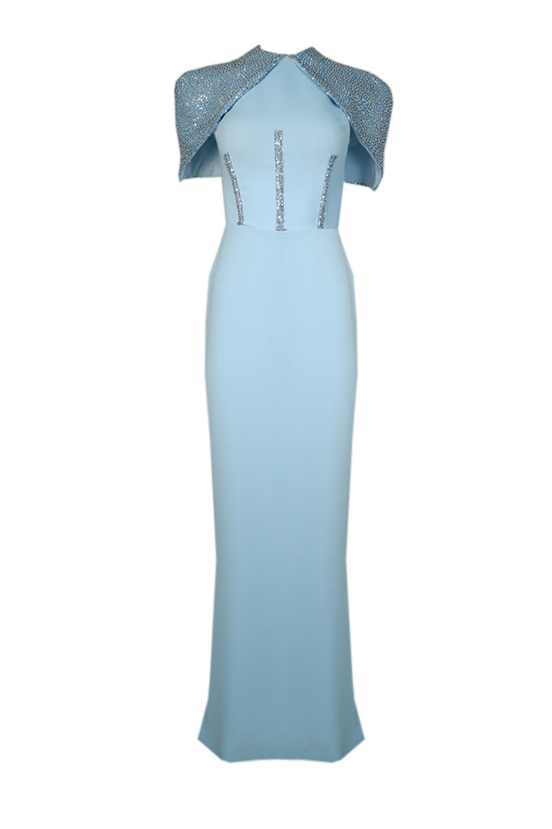 ينضح هذا الفستان ذو اللون الأزرق الفاتح بالأناقة الخالدة بتصميمه بلا أكمام وتفاصيل التطريز الأمامية المعقدة. ومع ذلك، فإن ما يجعلها رائعة حقًا هو الرداء المطرز القابل للفصل، مما يضيف لمسة أثيرية وملكية إلى المجموعة. يعمل التطريز الدقيق على كل من الفستان والعباءة على رفع جماليته، مما يجعله مثاليًا للمناسبات الخاصة حيث تريد أن تشعر بالرقي والغرابة.