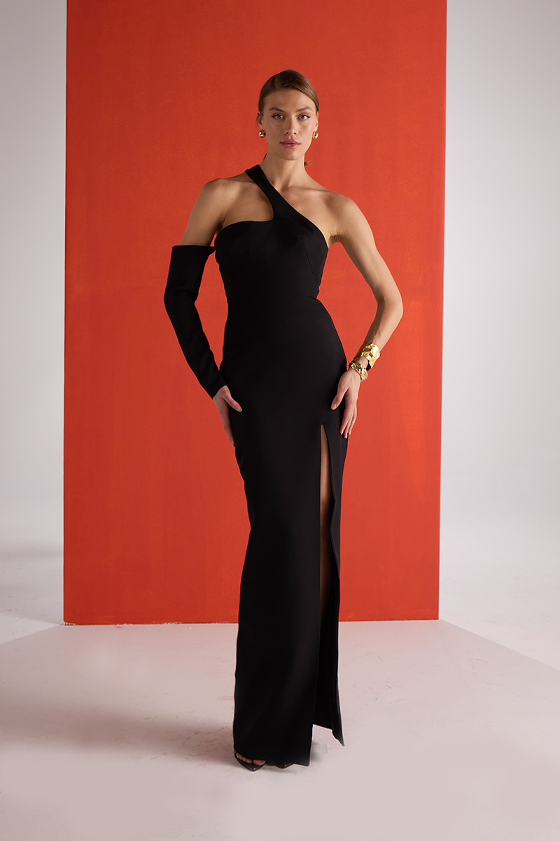 يتميز هذا الفستان الأسود المصنوع من الكريب بأناقته ورقيّه، فهو يعكس رقيًا عصريًا. يتميز بقصة خصر تُبرز جمال القوام، وتفاصيل مميزة عند الرقبة، مما يمنحه توازنًا مثاليًا بين الجرأة والرقة. يضفي الكمّ الواحد القابل للفصل لمسة عصرية متعددة الاستخدامات، بينما يضمن التصميم الطويل أناقة خالدة. ويكتمل الفستان بإغلاق خلفي مخفي لإطلالة انسيابية.