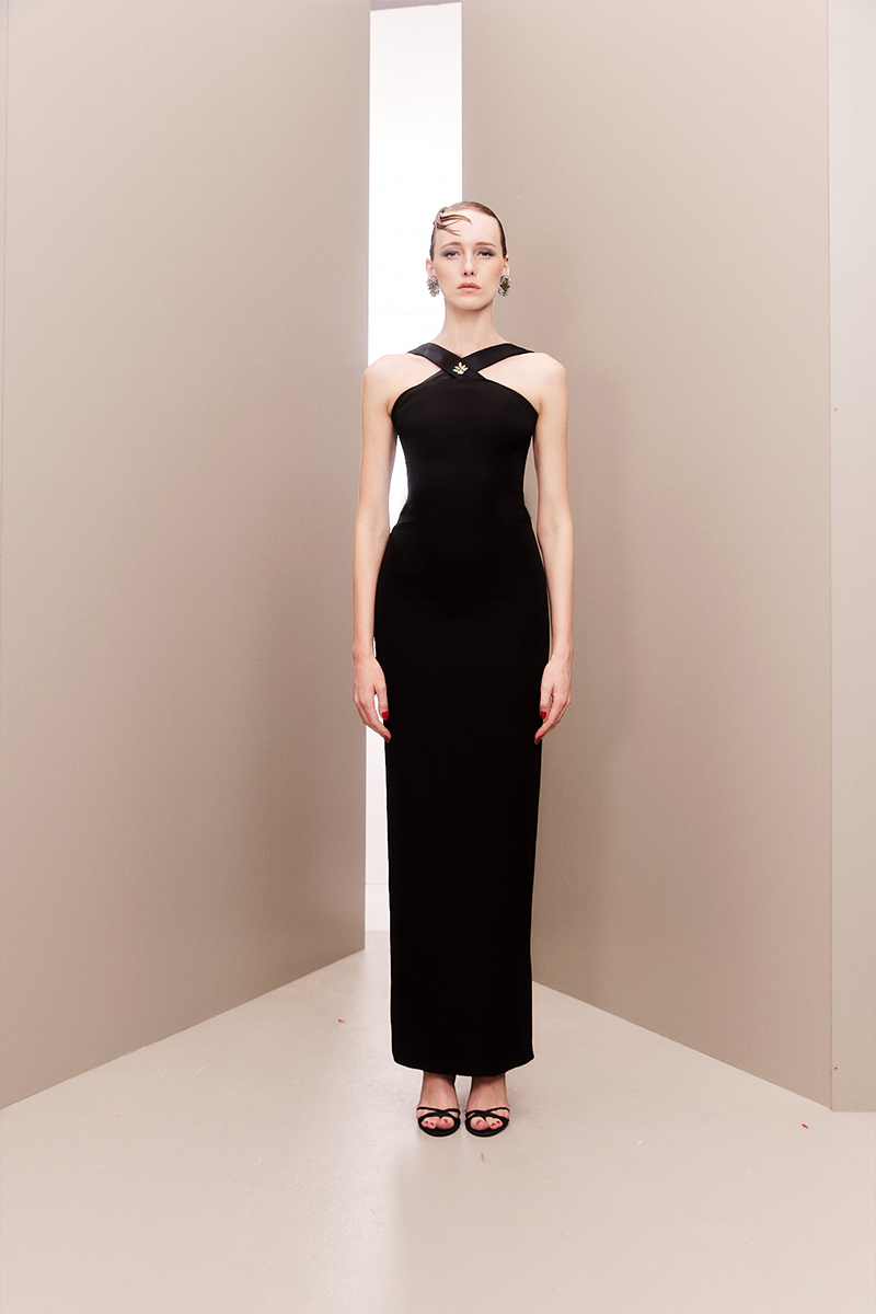 يتميز هذا الفستان من الكريب الأسود بتصميم أنيق ومتطور، ويجمع بين الأقمشة اللامعة وغير اللامعة للحصول على تأثير بصري فريد. يشكل الكريب الأسود غير اللامع القاعدة، بينما يتقاطع القماش اللامع مع المقدمة، مما يخلق تباينًا مذهلاً يضيف لمسة من السحر. تعمل الزخارف الحجرية ذات اللون اليانسوني على الجهة الأمامية على رفع مستوى الفستان، مما يوفر لمسة من الألوان والتألق الذي يلفت الأنظار. هذا المزيج من التفاصيل الأنيقة وعناصر التصميم الفريدة يجعل الفستان خيارًا مثاليًا للمناسبات الخاصة.