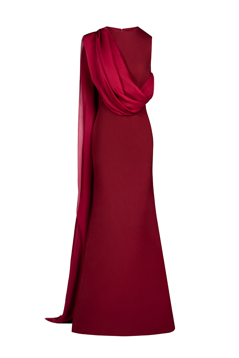 يتميز هذا الفستان الطويل بلونه العنابي الأنيق والراقي، وقصته الانسيابية بدون أكمام، مع كاب موسلين فاخر بكتف واحد. صُنع الفستان من قماش الكريب الفاخر ليمنحه انسيابية رائعة، ويُغلق من الخلف بإغلاق مخفي لإطلالة مثالية. مثالي للمناسبات المسائية أو الرسمية.