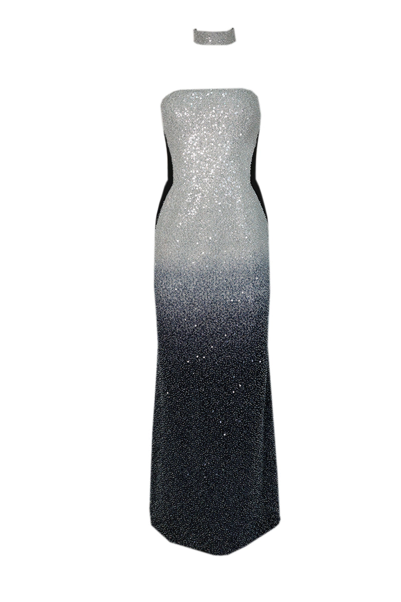 فستان Ethereal Ombre المطرز بدون حمالات هو فستان سهرة مذهل ينتقل بسلاسة من الفضي إلى الأسود بتأثير متدرج آسر. هذا الفستان بدون حمالات مزين بالكامل، ويتميز بتطريز معقد يعزز جاذبيته الفاخرة. تخلق الألواح الجانبية السوداء وهمًا بصريًا، مما يجعل الخصر يبدو أنحف ويبرز منحنيات الجسم للحصول على صورة ظلية جذابة. مثالي لمدخل درامي، يجمع هذا الفستان بين التصميم المتطور والتفاصيل التي تعزز الشكل.