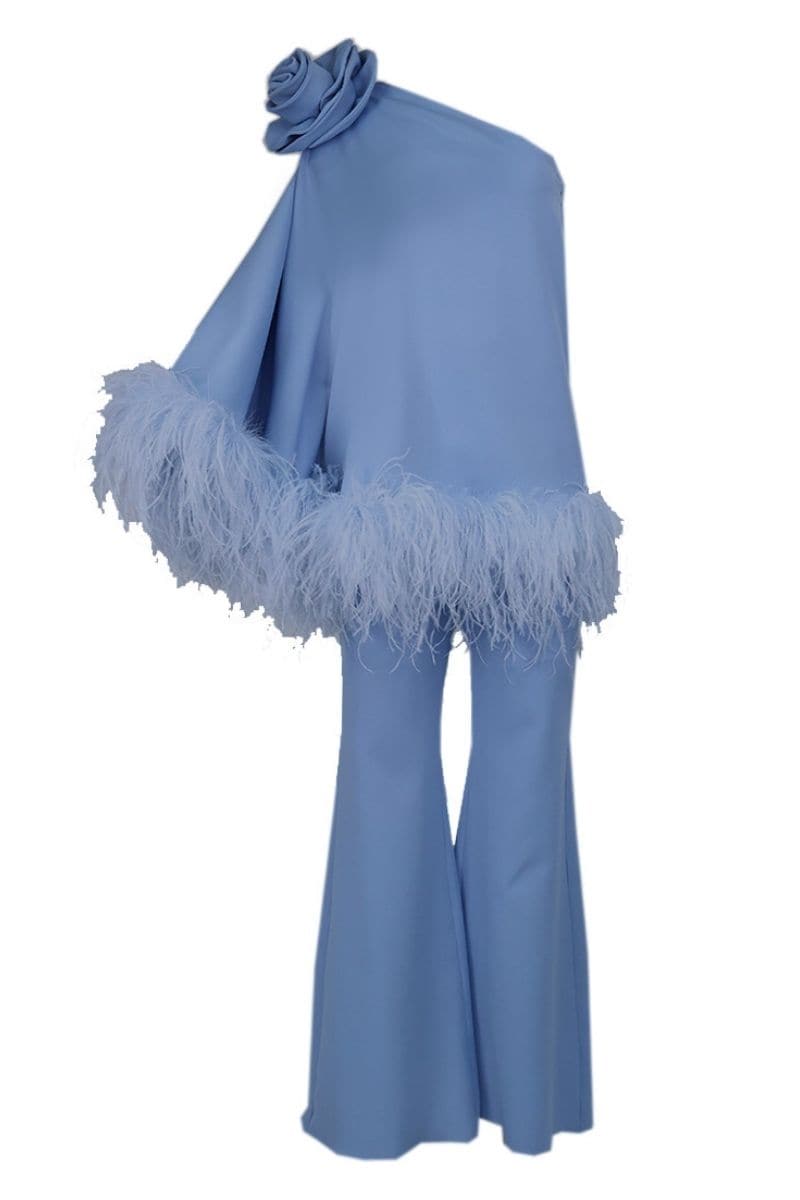 نقدم لك بلوزة زرقاء أنيقة بكتف واحد، ومزينة بزهرة قماشية كبيرة الحجم على الكتف. تضيف تفاصيل الريشة حول الجزء العلوي عنصرًا من الرقي والسحر. يضيف تصميم الأكمام الجرسية عنصرًا من الرقي، مع الحفاظ على مجموعة أنيقة وسهلة الارتداء. تنضح هذه المجموعة مع بنطال واسع القطع بسحر خالد. وبدلاً من ذلك، يمكن إقران الجزء العلوي بمجموعة متنوعة من الخيارات لإمكانيات تصميم لا حصر لها.