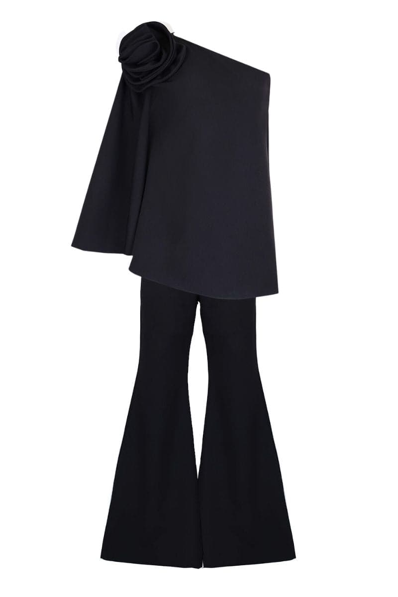 نقدم لك بلوزة سوداء أنيقة بكتف واحد، ومزينة بزهرة قماشية كبيرة متطابقة على الكتف. يضيف تصميم الأكمام الجرسية عنصرًا من الرقي مع الحفاظ على مجموعة أنيقة وسهلة الارتداء. تنضح هذه المجموعة مع بنطال واسع القطع بسحر خالد. السراويل تأتي بمقاسات XS، S، M، L، XL، XXL. وبدلاً من ذلك، يمكن إقران الجزء العلوي بمجموعة متنوعة من الخيارات لإمكانيات تصميم لا حصر لها.