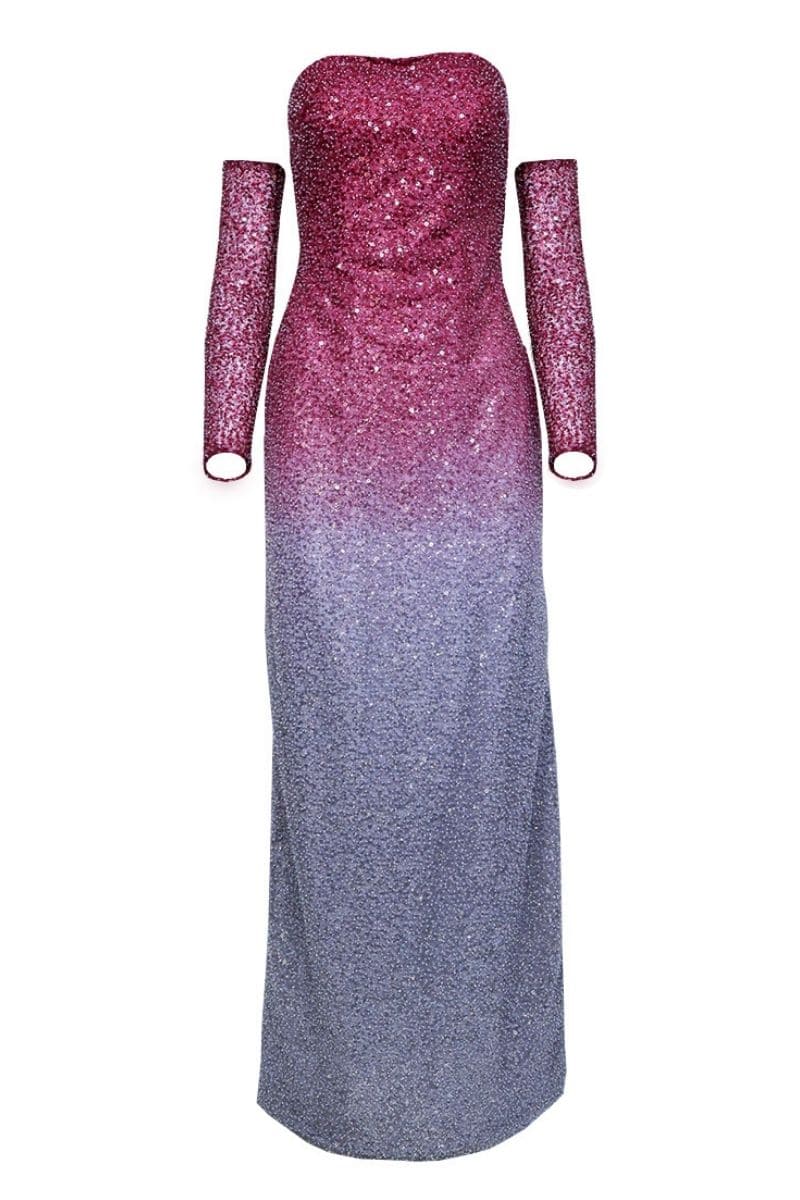 فستان منمق بالكامل من اللون العنابي إلى الفضي