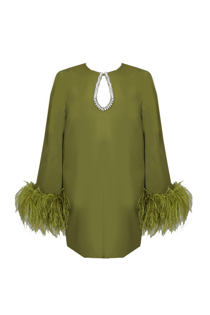 فستان "أنيس" القصير قطعة أنيقة وملفتة، تجمع بين الأناقة والجرأة في تصميمها. يتميز الفستان بأكمام واسعة وواسعة مزينة بتفاصيل ريش فاخرة، مما يضفي عليه لمسة من الفخامة والرقي. أما ظهر الفستان، فهو مزود بسحاب مخفي، مما يضمن إطلالة أنيقة.