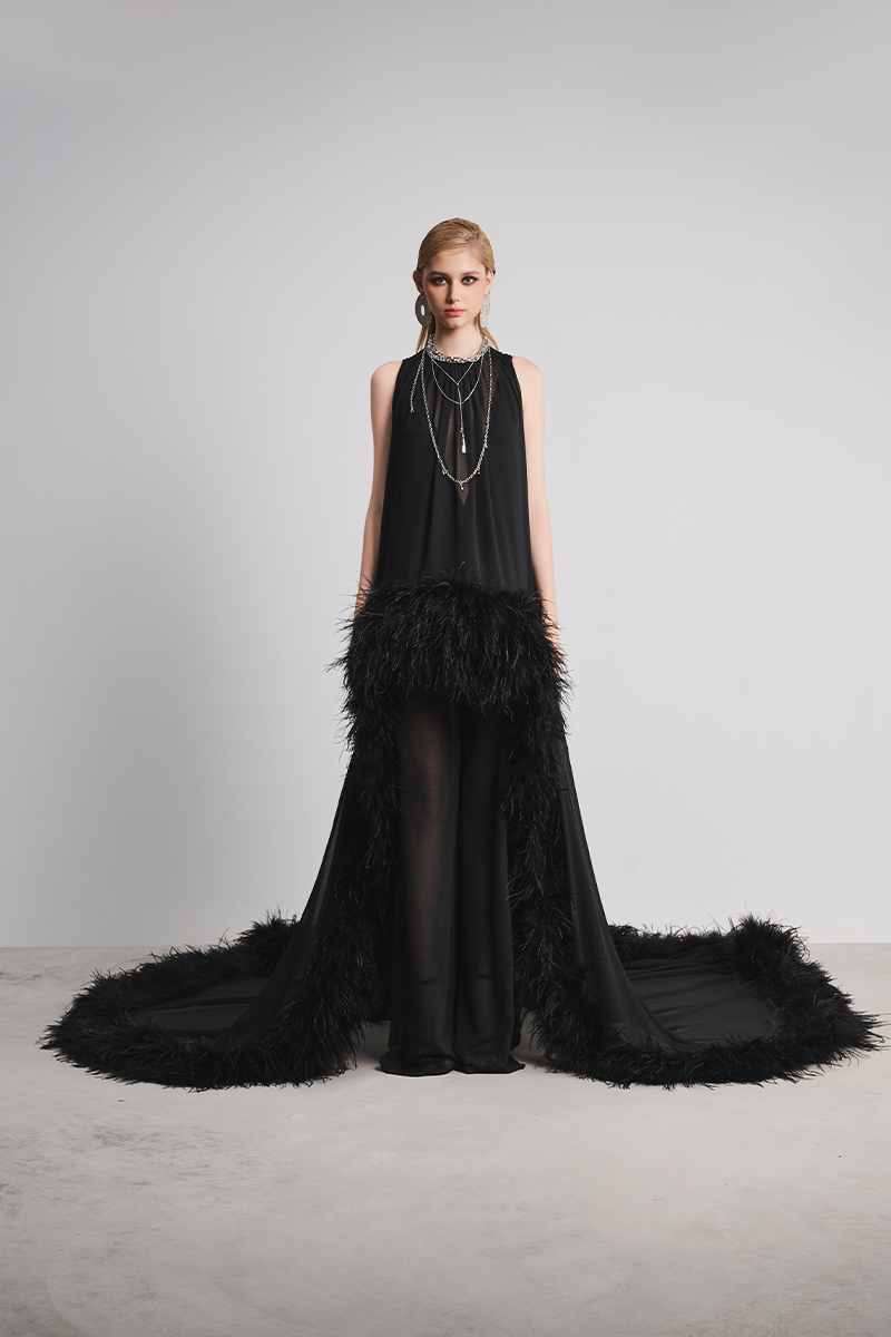 تم تصميم الزي المثير للإعجاب من خلال الجمع الماهر بين عناصر مختلفة. إن الجمع بين البدلة الكاملة والسراويل الطويلة المصنوعة من الشيفون الناعم يبرز جمال مرتديتها الجذاب والأنثوي. إضافة بلوزة طويلة مزينة بتفاصيل ريش عصرية تكمل المجموعة، مما يجعلها آسرة ومذهلة.
