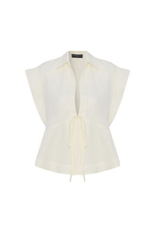 قميص galia ecru من الكتان بأكمام قصيرة وربطة عنق