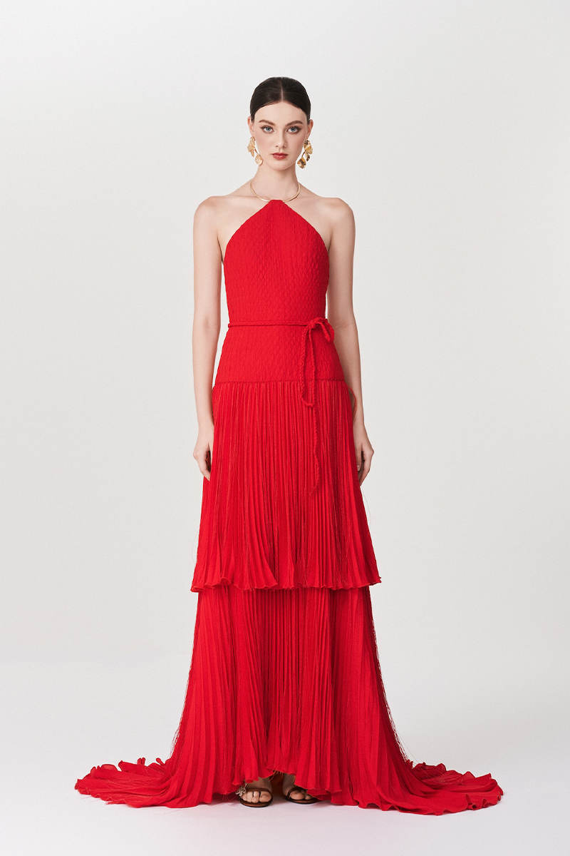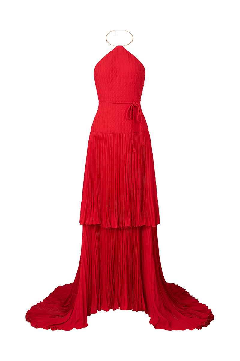 يتميز التصميم باللون الأحمر من الشيفون عالي الجودة، ويتميز بتفاصيل على شكل ماسي مخيط يدويًا بواسطة فريق التصميم. التنورة ذات الطبقات، مع طيات مطوية، تمنح من ترتديها إحساسًا بالخفة والأنوثة والرشاقة.