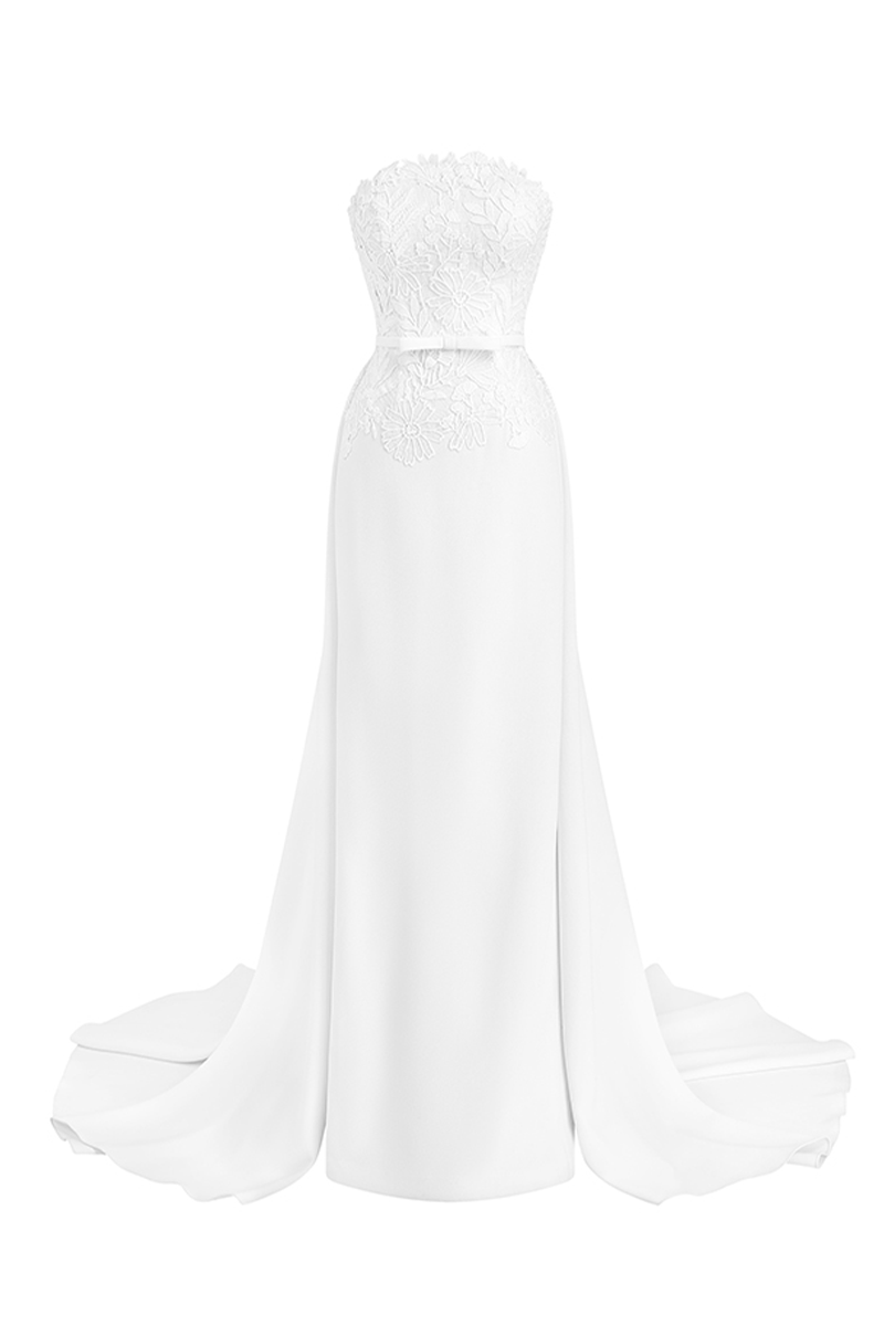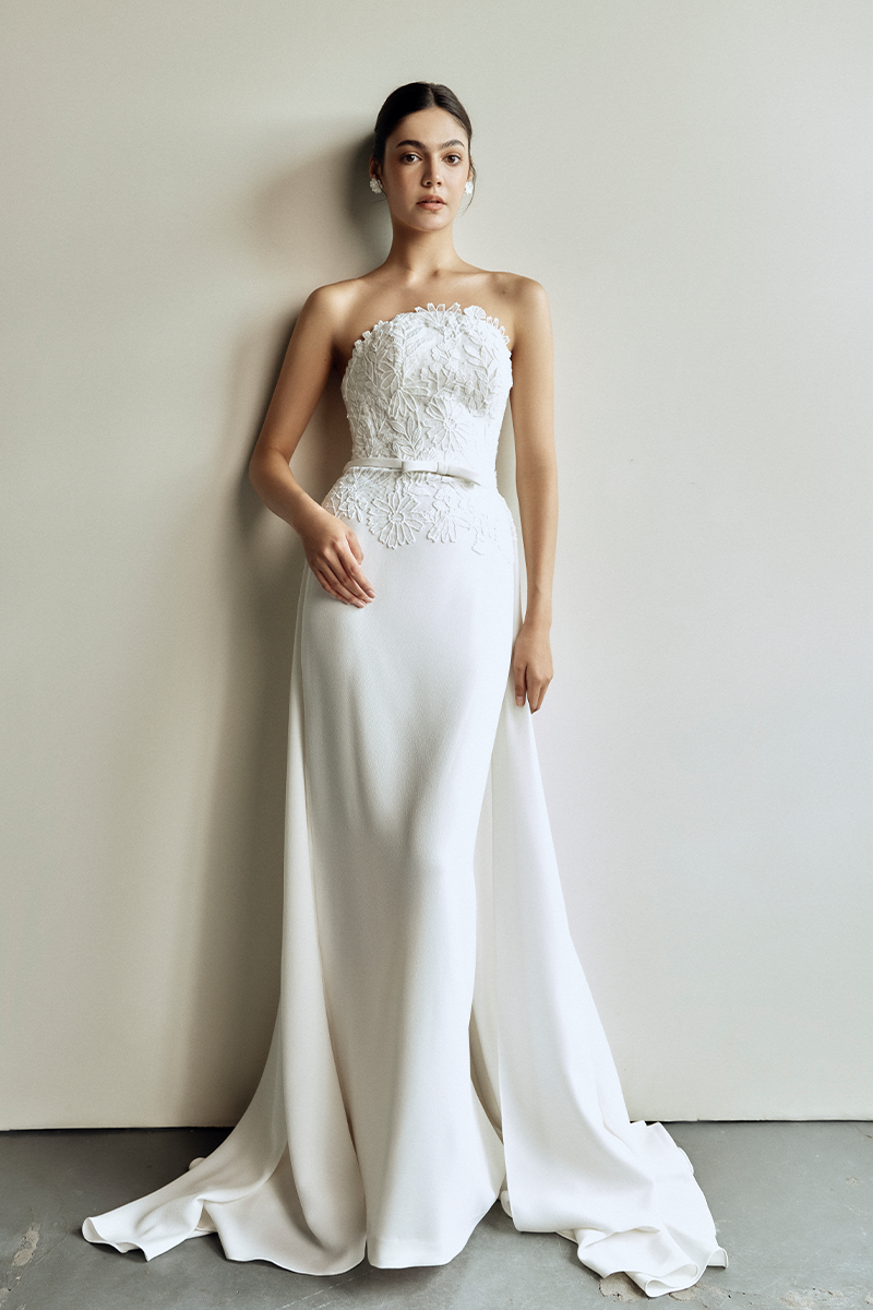 يتميز هذا الفستان بتصميم مستقيم مع تصميم ملائم ومتوهج، مع تنورة علوية مصنوعة يدويًا من فيتنام.