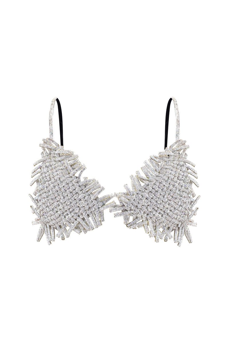 حمالة صدر مثلثة الشكل مصنوعة من حبال أحجار الراين المميزة من Nué، تتميز بتصميم كروشيه مع حواف مزينة بشراشيب وأشرطة كريستالية رقيقة. تُثبّت بقفل خطافي من الخلف.