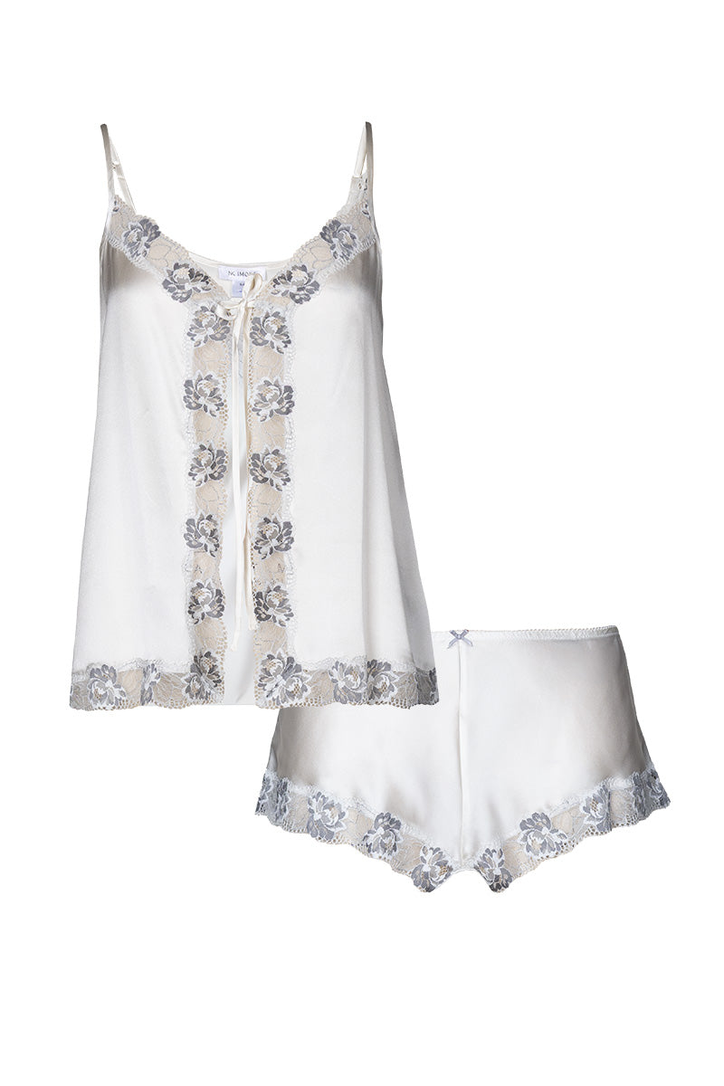 طقم كامي العروس ميمي يجمع بين الأناقة البسيطة والراحة. مصنوع من حرير شارموز العاجي مع لمسات من الدانتيل، هذا الطقم المكون من كاميسول وشورت متناسق مثالي لحفلات ما قبل الزفاف، أو لتقديم الهدايا، أو للاسترخاء في شهر العسل.