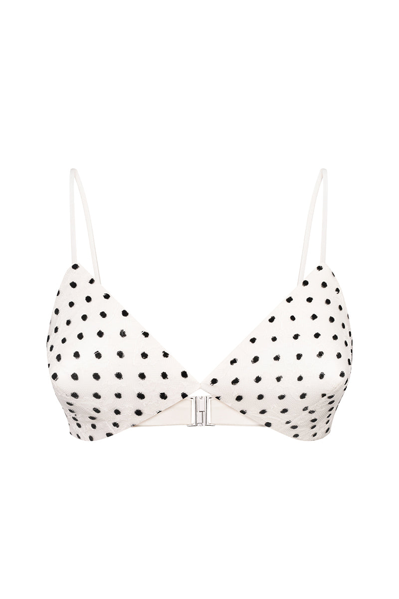 حمالة صدر مثلثة الشكل مصممة على شكل رصاصة مصنوعة من دانتيل سولستيس المنقط، ومزينة بأشرطة رفيعة رقيقة ومشبك خلفي. وهي مبطنة بالكامل بالحرير.