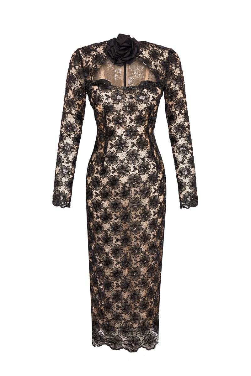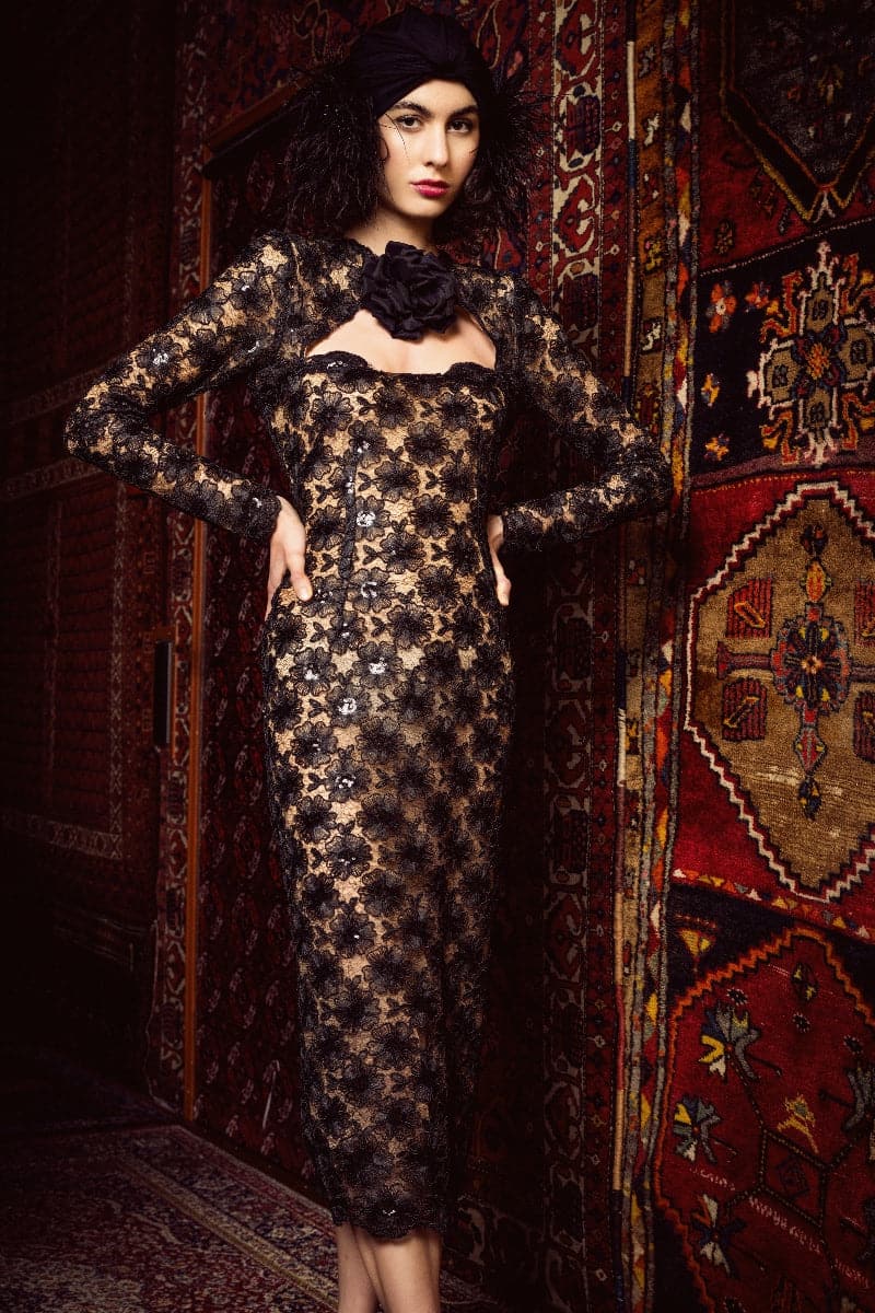 فستان دينا مصنوع من التول المرصع بالترتر، ومزين بالترتر المستوحى من الأزهار، ويتميز بفتحة مؤطرة على الصدر مع وردة ساتان ثلاثية الأبعاد قابلة للفصل. تم تصميم المقاس القريب ليناسب منحنياتك بشكل مريح.