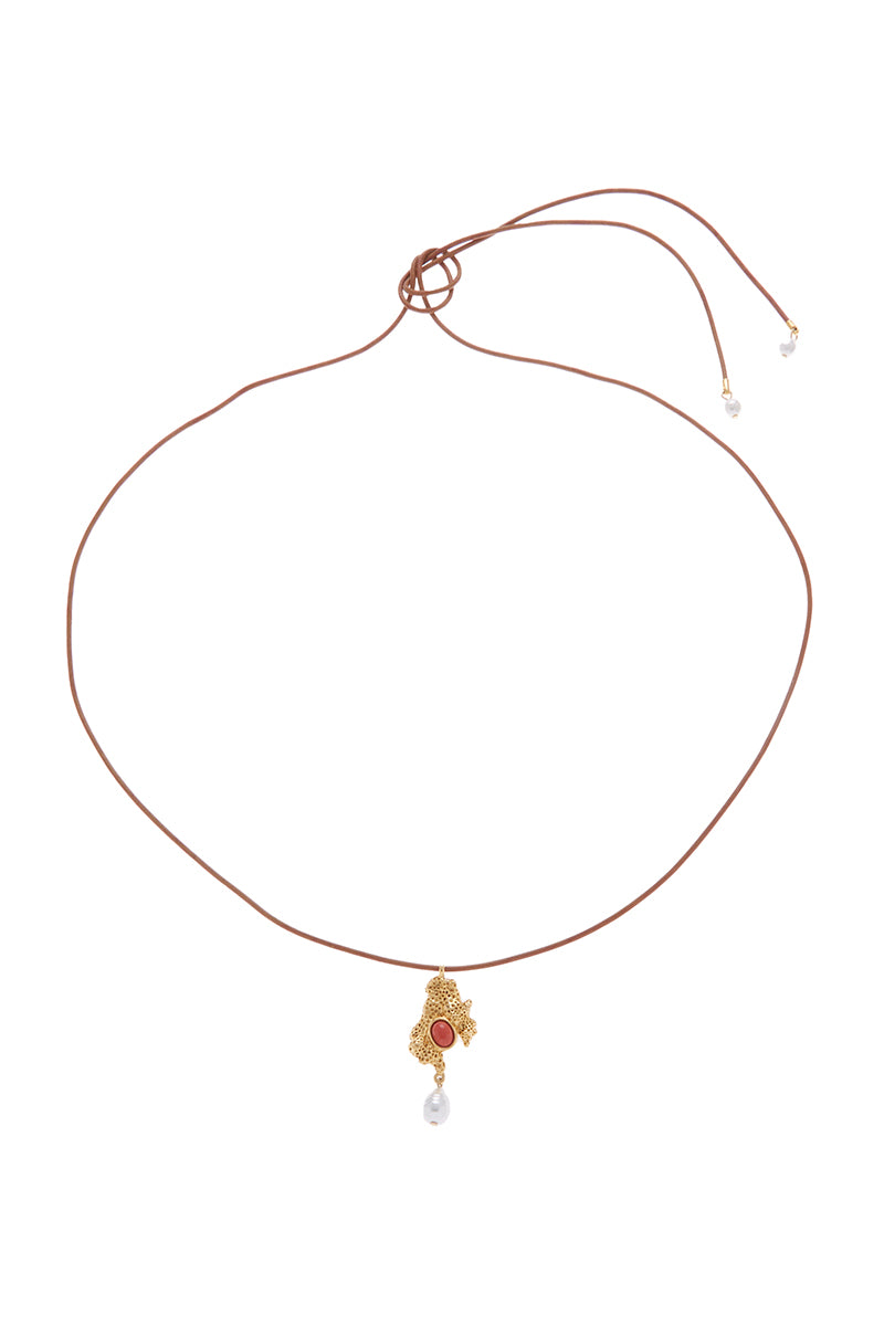 التكوين: قلادة من النحاس المطلي بالذهب عيار 24 قيراط مع لؤلؤ مرجاني وزجاجي مع سلك بني