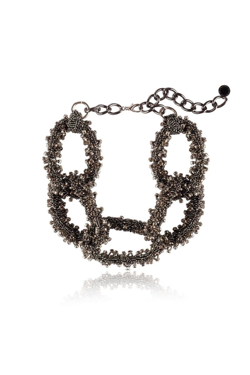 تتميز القطعة بتصميم متقن مع بلورات أكريليك رمادية وخرزات صغيرة مزخرفة بدرجات اللون الرمادي. كما أنها مزودة بمشبك قابل للتعديل. ستبدو القلادة جميلة أسفل عظام الترقوة.