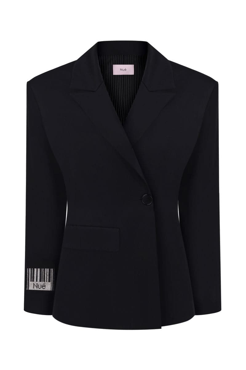سترة بليزر كبيرة الحجم مصممة خصيصًا من الساتان الأسود، مزينة برمز كريستالي من Nué على الأكمام. تتميز بأكتاف مبطنة بشكل مبالغ فيه، وياقات مدببة، وجيب واحد بغطاء. يُضفي زر الإغلاق الواحد لمسة أنيقة. مبطنة بالكامل بالفيسكوز.
