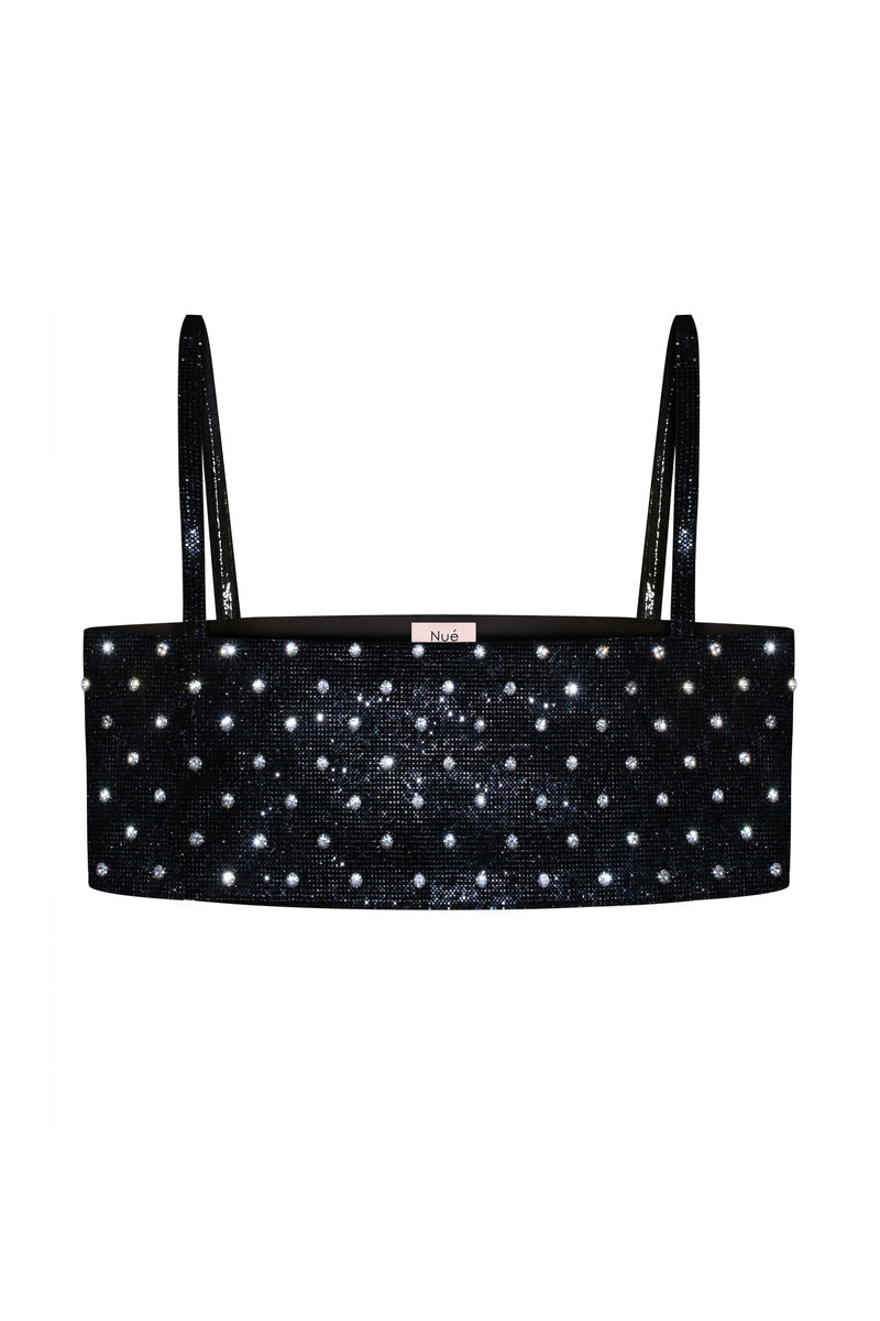 قطعة ملابس مصنوعة يدوياً. يتميز توب شارلوت الشهير بقماش مرصع بأحجار الراين ومزين باللؤلؤ ليُشكّل نقشة منقطة. يتميز بطول قصير، وفتحة رقبة مربعة، وحمالات رفيعة من السيليكون. يُغلق من الجانب بخطاف وعروة، ومبطن بالكامل بالحرير.
