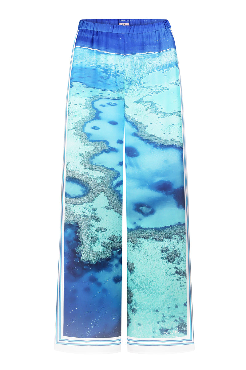 بنطلون واسع الساقين بتصميم مريح، مصنوع من قماش حريري مائل انسيابي بطبعة حصرية. يتميز بخصر منخفض وحزام خصر مطاطي.
