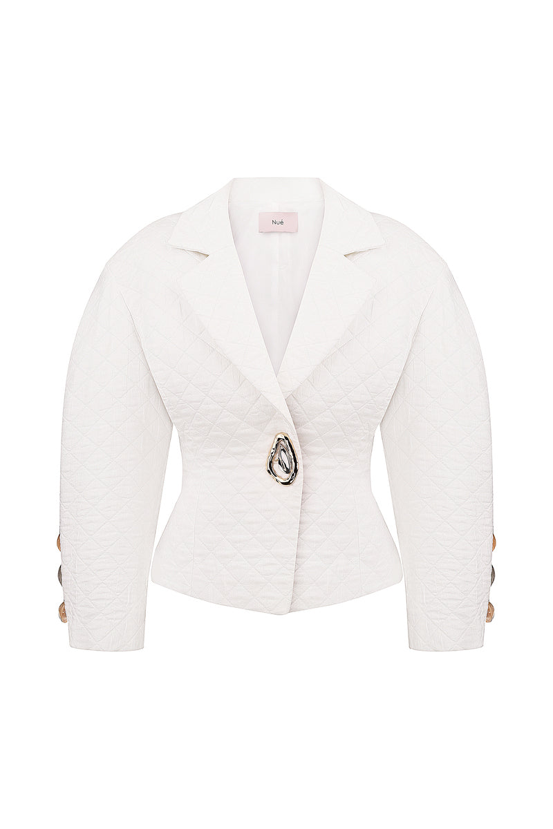 بليزر بصف أزرار واحد مصنوع من قماش جاكار بنقشة مبطنة، يتميز بخصر محدد وأكمام منتفخة مزينة بأزرار كبيرة. يُختتم البليزر بياقة مدببة وإغلاق بإبزيم وزر ذي ملمس مميز. مبطن بالكامل بالفيسكوز.