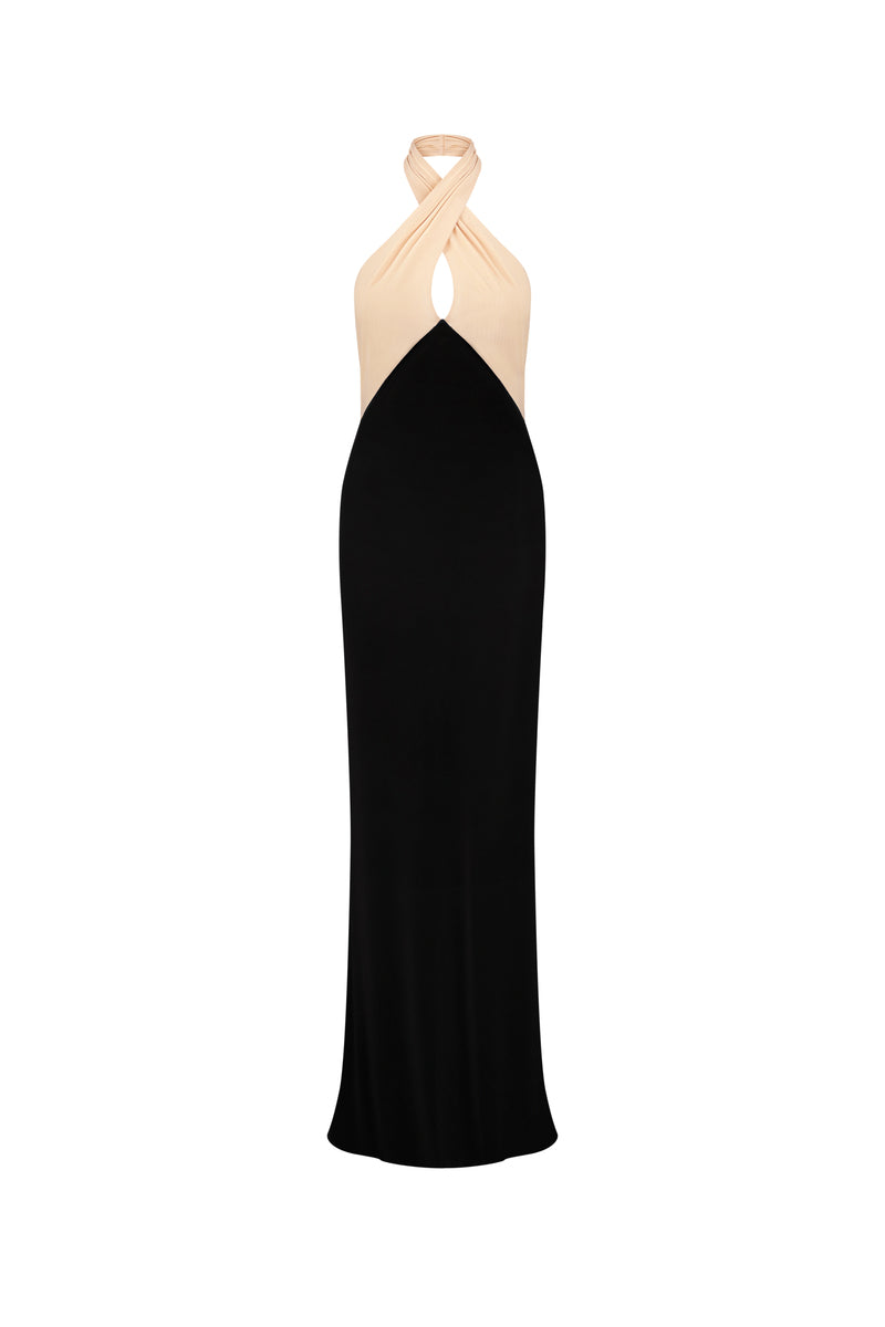 فستان يصل إلى الأرض بتصميم أنيق وظهر مفتوح جذاب يتم تسليط الضوء عليه من خلال صدّار شبكي بلون البشرة المتباين يلتف ليشكل فتحة رقبة بدون أكمام.