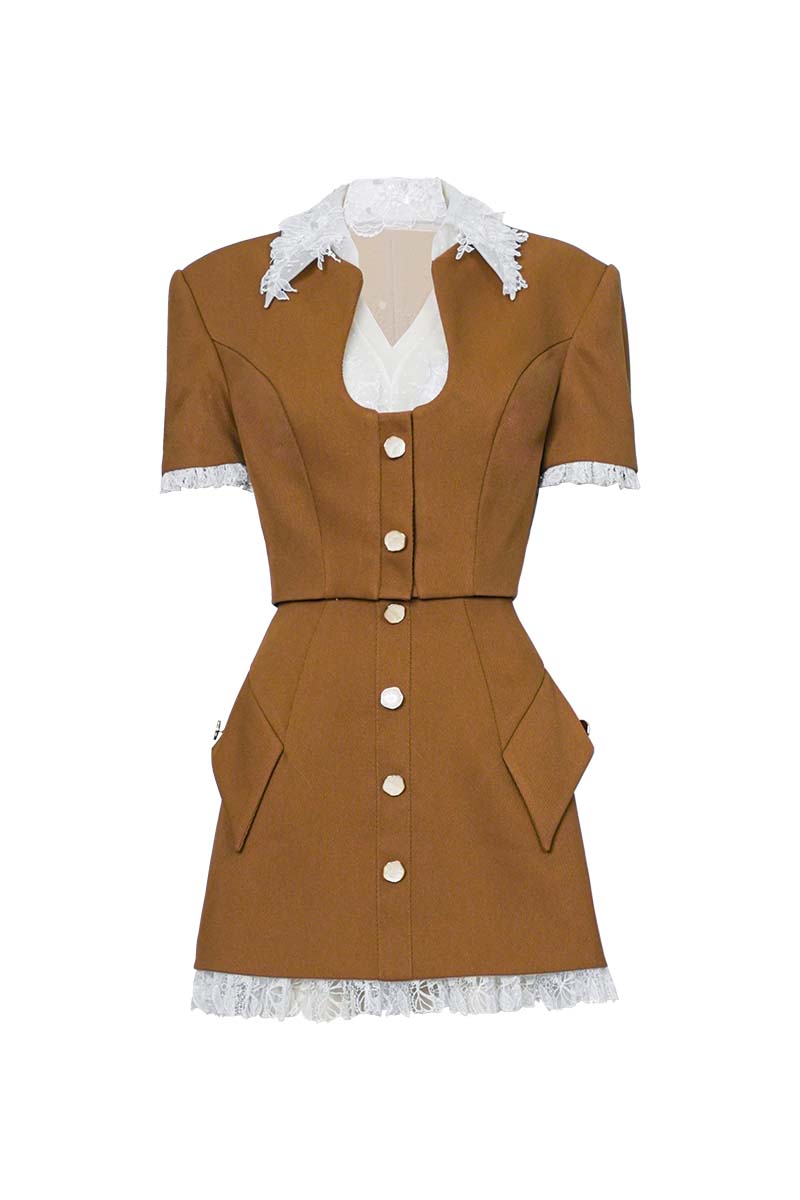 - مجموعة مزينة بالدانتيل باللونين البني والأبيض تجمع بين السحر الكلاسيكي والتفاصيل العصرية. - يتميز الجزء العلوي المقصوص بتصميم خالد، يبرز من خلال الدانتيل المطرز عند الياقة والأصفاد، بالإضافة إلى صف من الأزرار البارزة في المقدمة.