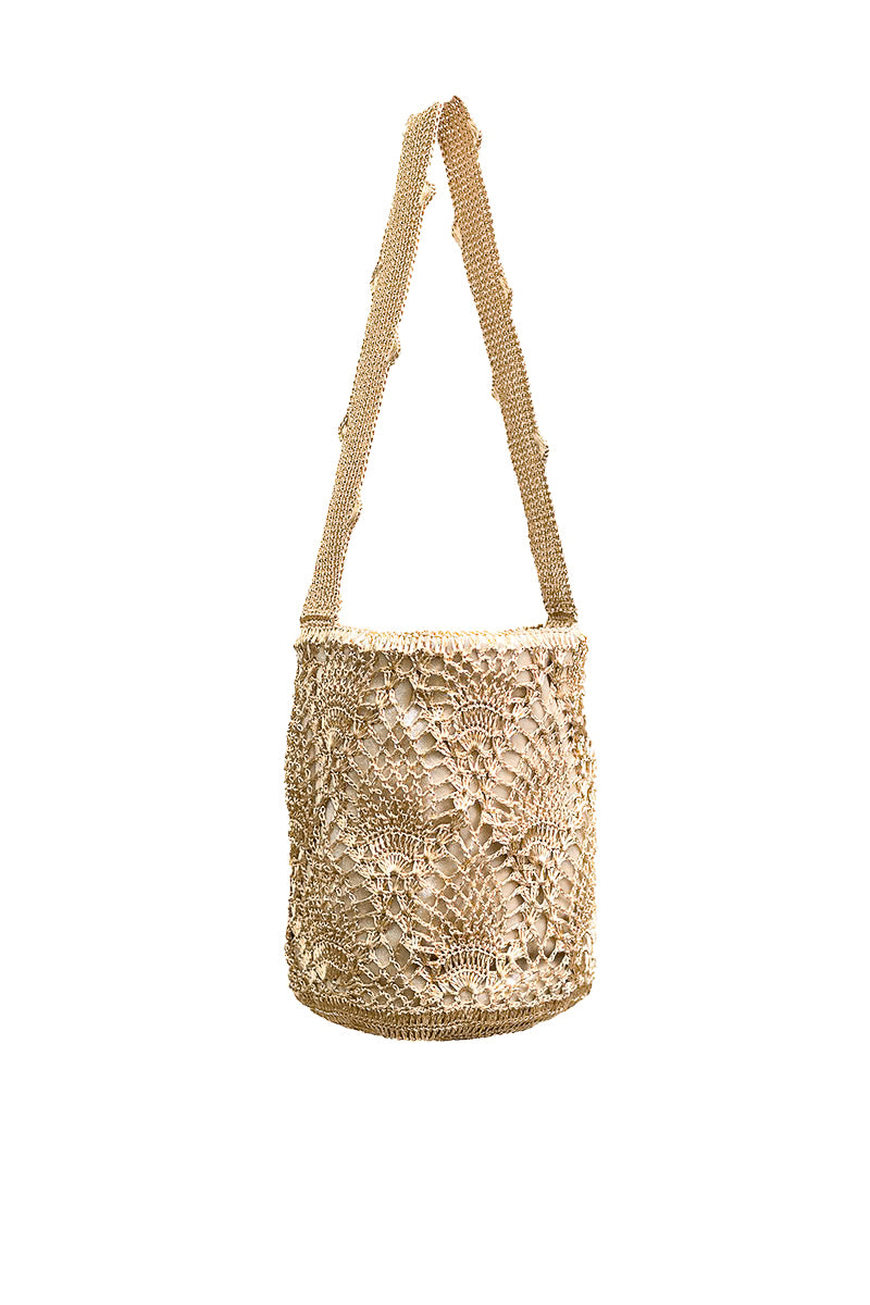 حقيبة ظهر منسوجة يدويًا بنمط الأناناس، مستوحاة من حيوانات ونباتات أمريكا اللاتينية النابضة بالحياة. صُنعت هذه الحقيبة من خيوط معدنية مطلية بالفضة، وبطانة مخملية بيج، وجيبان داخليان، وقفل مغناطيسي.