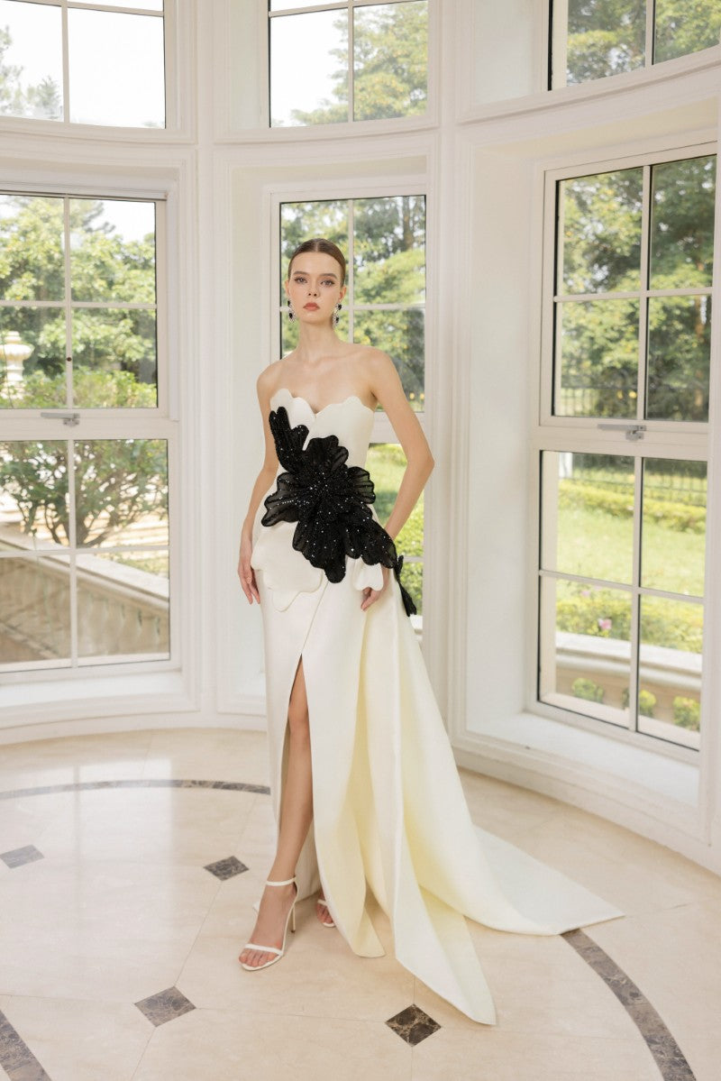 يمزج هذا الفستان المسائي غير المتماثل بين الأناقة الخالدة واللمسة الفنية العصرية. يتميز تصميمه بدون حمالات بفتحة جانبية انسيابية، بينما يُضفي تطريز الأزهار ثلاثي الأبعاد الجريء عند الخصر بتلات منحوتة لتأثير ساحر. ألوانه المتباينة وأقمشةه العاكسة للضوء تجعله قطعةً مميزةً لافتةً للنظر.